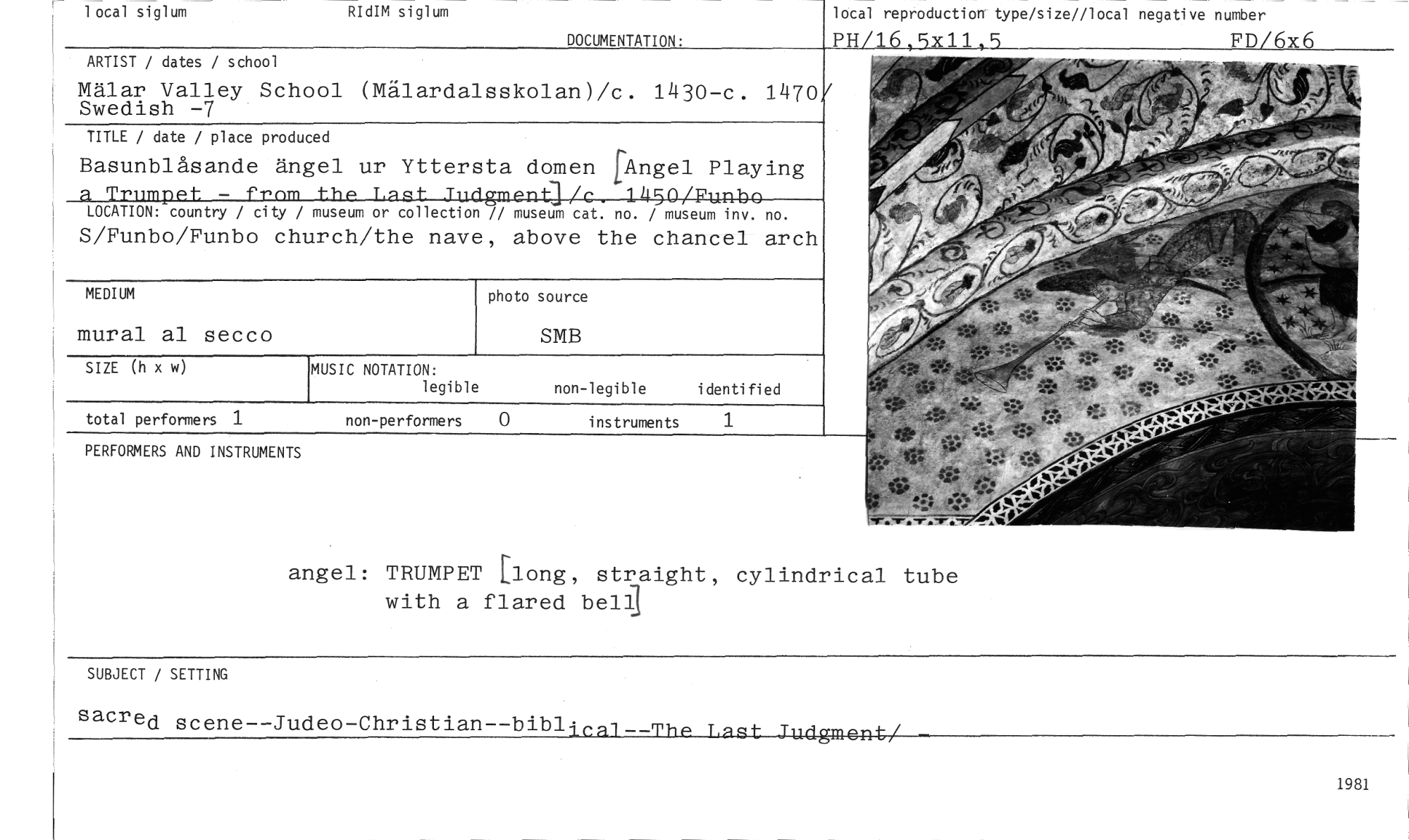 //// local siglum RIdIM siglum //// DOCUMENTATION. //// 1981 //// non-perfonners 0 instruments 1 //// total perfonners 1 //// ARTIST / dates / school //// Mälar Valley School (Mälardalsskolan)/c. 1430-c. 1470 Swedish -7 //// TITLE / date / place produced //// Basunblåsande ängel ur Yttersta domen fAngel Playing a Trumpet - from the Last Judgmerra/c 1450/F~--- //// wuknow country / city / museum or collection // museum cat. no. / museum inv. no. //// S/Funbo/Funbo church/the nave, above the chansel arch //// PERFORMERS AND INSTRUMENTS //// angel: TRUMPET bong, straight, cylindrical tube with a flared ben] //// SUBJECT / SETTING //// sacred scene--Judeo-Christian--bibl //// local reproduction type/size//local negative numer //// PH/16 5x11 5 FD/6x6 //// ,,- //// SIZE (h x w) //// MUSIC NOTATION: //// legible //// non-legible identified //// MEDIUM //// mural al secco //// photo source //// SMB ////