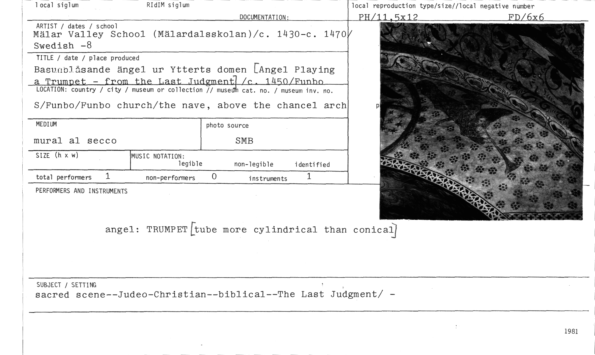 //// RIdIM siglum //// 1 ocal siglum //// local reproduction type/size//local negative number //// PH/11,5x12 FD/6x6 //// TITLE / date / place produced //// Basueblåsande ängel ur Ytterts domen [Angel Playing //// a Trumpet - from the Last Judgmenl/c-1450faunho___ //// LOCATION: country / city / museum or collection // muse cat. no. / museum inv. no. //// angel: TRUMPETLtube more cylindrical than conical //// SUBJECT / SETTING //// sacred scene--Judeo-Christian--biblical--The Last Judgment/ - //// tr. //// 1:4.1% -•••• //// • -. •.% //// iii Kt. •:- //// •:: 114 "54.1~4.1"-K+31F. //// PERFORMERS AND INSTRUMENTS //// DOCUMENTATION. //// ARTIST / dates / school //// Mälar Valley School (Mälardalsskolan)/c. 1430-c. 1470 Swedish -8 //// S/Funbo/Funbo church/the navs, above the chancel arch //// SIZE (h x w) //// MUSIC NOTATION: //// legible //// non-legible i denti fi ed //// MEDIUM //// mural al secco //// photo source //// SMB //// total performers 1 non-performers 0 instruments 1 ////