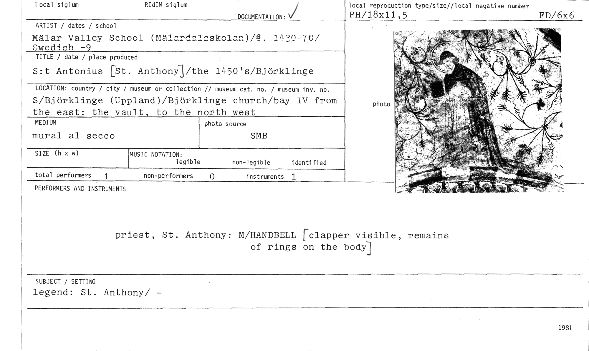 //// 1 otal siglum //// RIdIM siglum //// DOCUMENTATION: //// local reproduction type/size//local negative number //// PH/18x11,5 FD/6x6 //// ARTIST / dates / school //// Mälar Valley School (Mälardalcskolan)/@. 1430-70/ 21152411AP=9 //// TITLE / date / place produced //// S:t Antonius [St. AnthonYl/the 1450's/Björklinge //// LOCATION: country / city / museum or collection // museum cat. no. / museum inv. no. //// S/Björklinge (Uppland)/Björklinge church/bay IV from //// the east: the vault, to the north west //// MEDIUM photo source //// mural al secco SMB //// SIZE (h x w) //// non-legible identified //// total performers 1 non-performers 0 instruments 1 //// PERFORMERS AND INSTRUMENTS //// MUSIC NOTATION: //// legible //// priest, St. Anthony: M/HANDBELL rclapper visible, remains //// of rings on the body] //// SUBJECT / SETTING //// legend: St. Anthony/ - //// 1981 ////