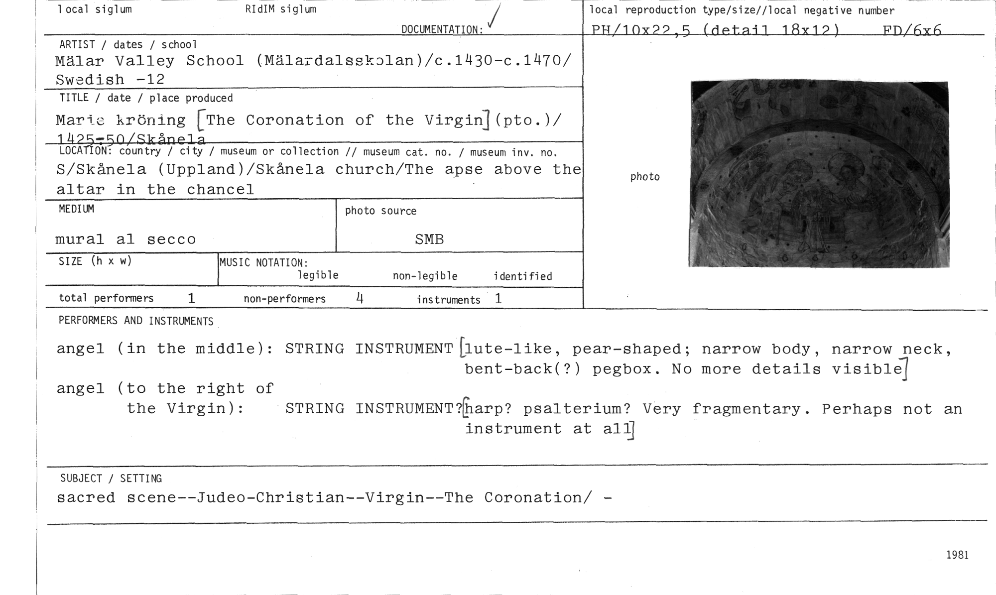 //// - 3 //// local reproduction type/size//local negative number //// PR/1nx29 5 (rlekan_lax12)___Eni_fix6___ //// ARTIST / dates / school //// Mälar Valley School (Mälardalsskplan)/c.1430-c.1470/ Swedish -12 //// TITLE / date / place produced //// Marie kröning [The Coronation of the VirginDpto.)/ //// 1495-5n/skåripa LOCATION: country / city / museum or collection // museum cat. no. / museum inv. no. //// S/Skånela (Uppland)/Skånela church/The apse above the altar in the chancel //// MEDIUM photo source //// mural al secco SMB //// SIZE (h x w) MUSIC NOTATION: non-legible identified //// legible //// total performers 1 non-performers instruments 1 //// PERFORMERS AND INSTRUMENTS //// photo //// local siglum RIdIM siglum //// DOCUMENTATION. //// angel (in the middle): STRING INSTRUMENT [lute-like, pear-shaped; narrow body, narrow neck, //// angel (to the right of //// the Virgin): STRING INSTRUMENTlharp? psalterium? Very fragmentary. Perhaps not an //// instrument at all] //// bent-back(?) pegbox. No more details visibleg //// SUBJECT / SETTING //// sacred scene--Judeo-Christian--Virgin--The Coronation/ - //// 1981 ////