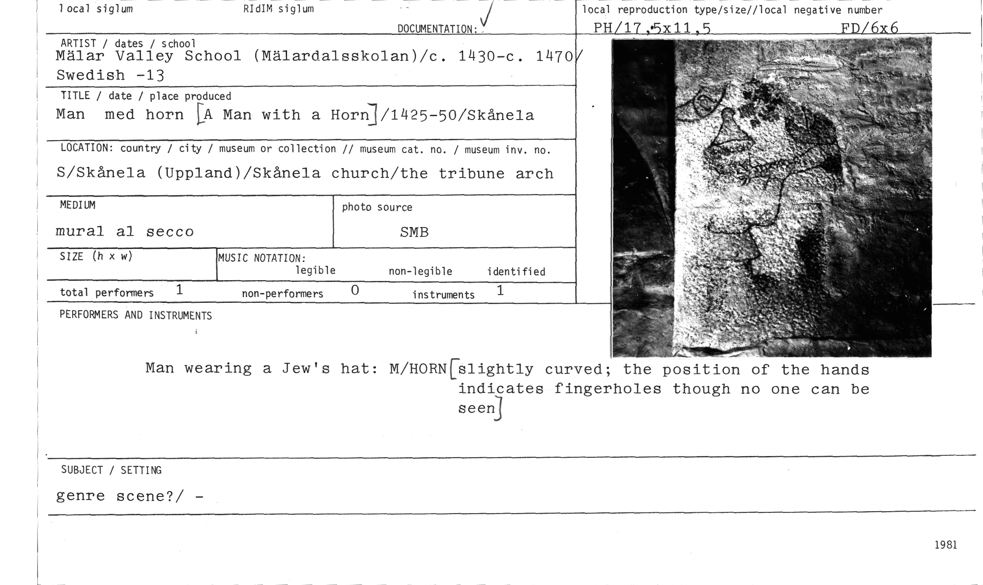 //// local reproduction type/size//local negative number //// PH/17 .•5x 11, 5 FD/6x6 //// ARTIST / dates / school //// Mälar Valley School (Mälardalsskolan)/c. 1430-c. 1470 Swedish -13 //// TITLE / date / place produced //// i Man med horn Pk. Man with a Horn]/1425-50/Skånela //// LOCATION: country / city / museum or collection // museum cat. no. / museum inv. no. //// S/Skånela (Uppland)/Skånela church/the tribune arch //// MEDIUM //// mural al secco //// SIZE (h x w) //// total performers 1 non-performers 0 instruments 1 //// PERFORMERS AND INSTRUMENTS //// MUSIC NOTATION: //// legible non-legible identified //// photo source //// SMB //// local siglum RIdIM siglum //// DOCUMENTATION: //// Man wearing a Jew's hat: WHORN5lightly turved; the position of the hands indicates fingerholes though no one can be seen] //// SUBJECT / SETTING //// genre scene?/ - //// 1981 ////