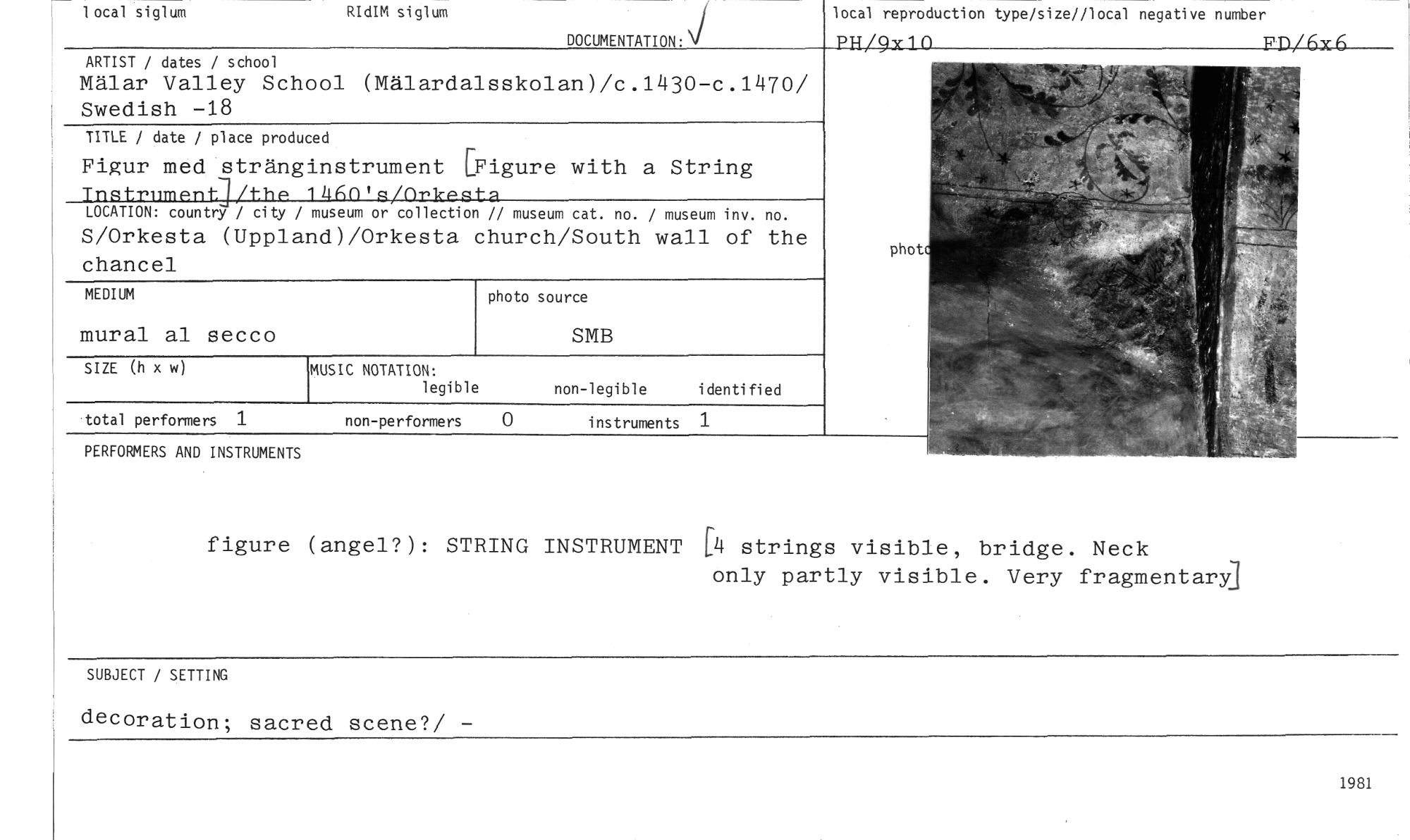 //// SUBJECT / SETTING //// decoration; sacred scene?/ - //// II //// • Il //// photo source //// RIdIM siglum //// 1 ocal siglum //// DOCUMENTATION: //// local reproduction type/size//local negative number //// PH/93[10 FD/6x6 //// ARTIST / dates / school //// Mälar Valley School (Mälardalsskolan)/c.1430-c.1470/ Swedish -18 //// TITLE / date / place produced //// Figur med stränginstrument [Figure with a String //// LOCATION: country / city / museum or collection // museum cat. no. / museum inv. no. //// S/Orkesta (Uppland)/Orkesta church/South wall of the chancel //// phot //// SIZE (h x w) //// MUSIC NOTATION: //// legible //// non-legible identified //// SMB //// total performers 1 non-performers //// PERFORMERS AND INSTRUMENTS //// figure (angel?): STRING INSTRUMENT [4 strings visible, bridge. Neck //// only partly visible. Very fragmentary] //// 1 //// MEDIUM //// mural al secco //// 1981 ////