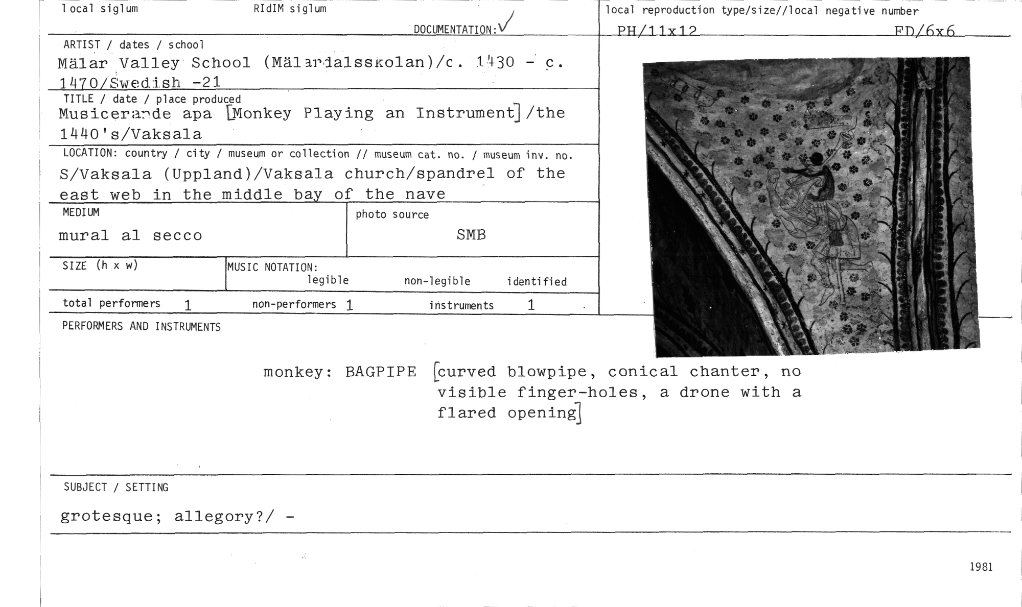 //// DOCUMENTATION: //// local reproduction type/sizefflocal negative number PH/il lyl 2 FD/61-6 //// 1 otal siglum RIdIM siglum //// ARTIST / dates / school //// Mälar Valley School (Mälardalsskolan)/c. 1430 -c 1470/Swedish -21 //// TITLE / date / place produced //// Musicerande apa [monkey Playing an Instrumenthe 1440's/Vaksala //// LOCATION: country / city / museum or collection // museum cat. no. / museum inv. no. //// S/Vaksala (Uppland)/Vaksala church/spandrel of the //// east web in the middle bay of the nave //// MEDIUM photo source //// mural al secco SMB //// MUSIC NOTATION: //// legible //// non-legible identified //// SIZE (h x w) //// total performers 1 non-performers 1 instruments 1 //// PERFORMERS AND INSTRUMENTS //// monkey: BAGPIPE [curved blowpipe, conical chanter, no visible finger-holes, a drone with a flared opening] //// SUBJECT / SETTING //// grotesque; allegory?/ — //// 1981 ////