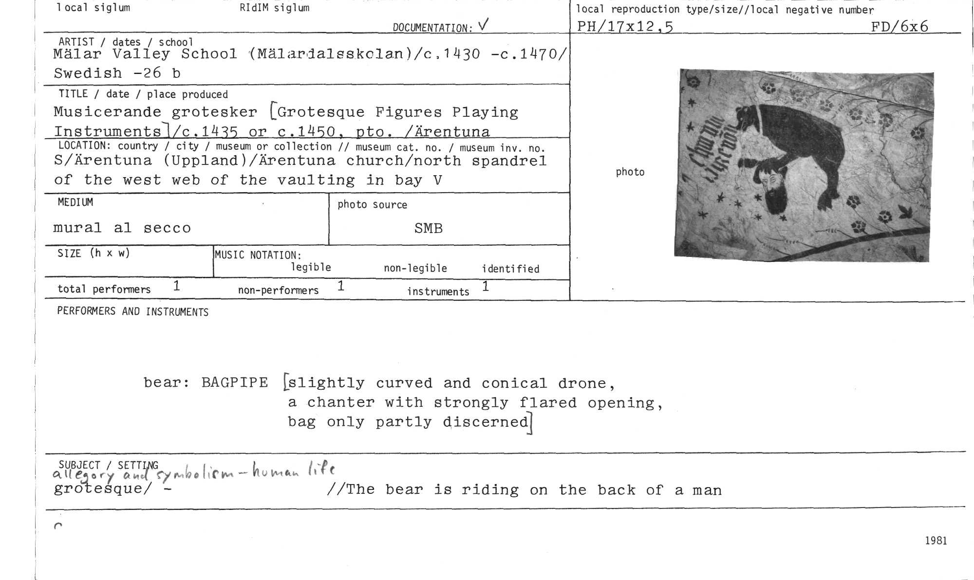 //// 1 ocal siglum RIdIM siglum //// local reproduction type/size//local negative number //// PH/17X12,5 FD/6X6 //// DOCUMENTATION: V //// ARTIST / dates / school //// Mälar Valley School (Mälardalsskclan)/c,1430 -c.1470/ Swedish -26 b //// TITLE / date / place produced //// Musicerande grotesker [Grotesque Figures Playing Instruments(/c.1435 or c.1450. pto. /Ärentuna //// LOCATION: country / city / museum or collection // museum cat. no. / museum inv. no. //// S/Ärentuna (Uppland)/Ärentuna church/north spandrel of the west web of the vaulting in bay V //// MEDIUM //// mural al secco //// SIZE (h x w) //// non-legible identified //// total performers 1 non-performers 1 instruments 1 //// photo source //// SMB //// MUSIC NOTATION: //// legible //// photo //// PERFORMERS AND INSTRUMENTS //// bear: BAGPIPE [slightly curved and conical drone, //// a chanter with strongly flared opening, bag only partly discerned] //// SUBJECT / SETTI,NG k //// . Attelory ak4 9•42ettkl",,,— ukia //// grotesque/ - //The bear is riding on the back of a man //// 1981 ////