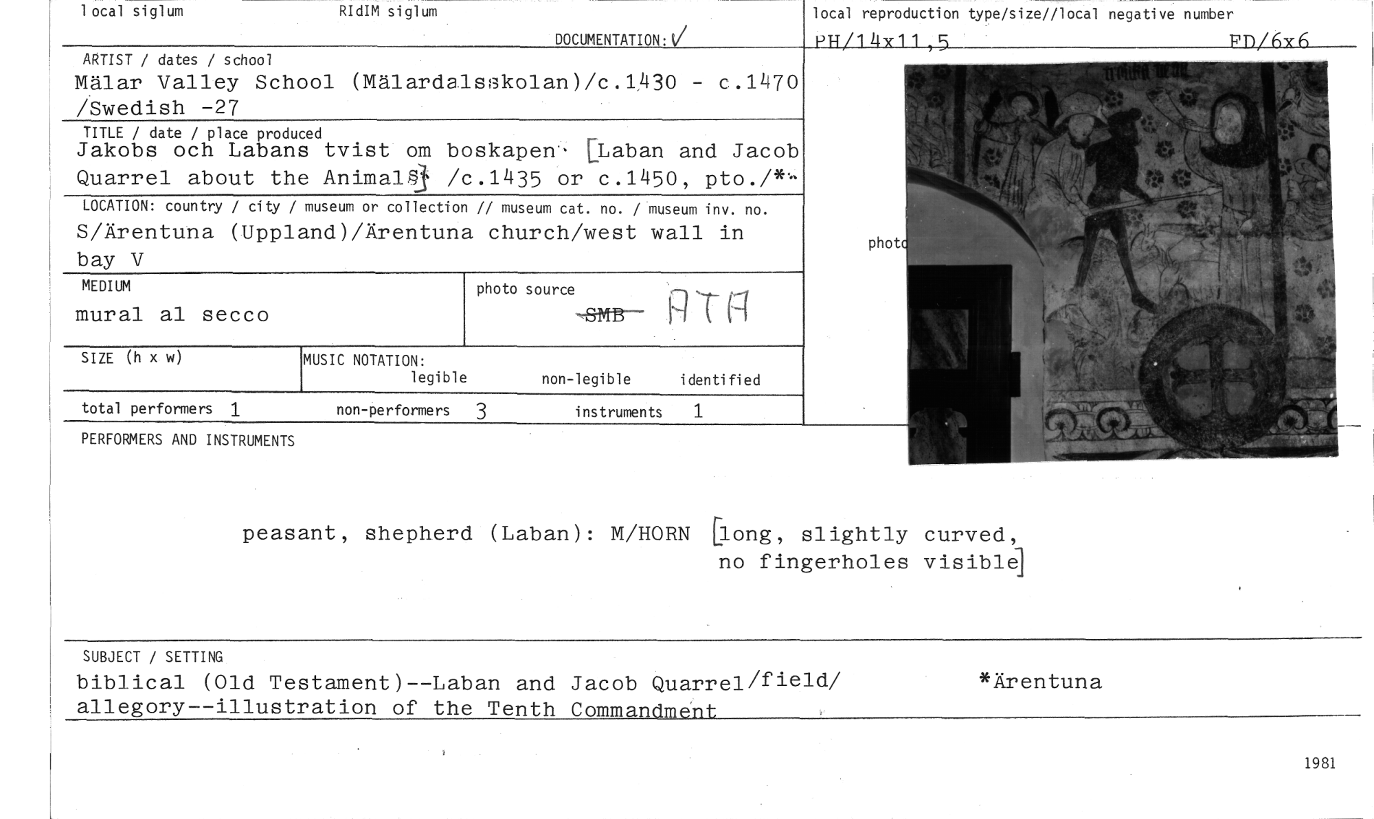 //// local reproduction type/size//local negative nutuber //// PT4/1 Lbr1 1 ,5 FD/h7-6 //// 1 ocal siglum RIdIM siglum //// DOCUMENTATION: V //// ARTIST / dates / school //// Mälar Valley School (Mälardalsskolan)/c.1430 - c.1470 /Swedish -27 //// TITLE / date / place produced //// Jakobs och Labans tvist om boskapen, [Laban and Jacob //// Quarrel about the Animal§.} /c.1435 or c.1450, pto./*'• //// LOCATION: country / city / museum or collection // museum cat. no. /museum inv. no. //// S/Ärentuna (Uppland)/Ärentuna church/west wall in bay V //// photo source //// -eter- H (g //// SIZE (h x w) //// non-legible identified //// total performers 1 non-performers 3 instruments 1 //// PERFORMERS AND INSTRUMENTS //// MEDIUM //// mural al secco //// MUSIC NOTATION: //// legible //// peasant, shepherd (Laban): M/HORN [lang, slightly curved, //// no fingerholes visible] //// SUBJECT / SETTING *Ärentuna //// biblical (Old Testament)--Laban and Jacob Quarrel/field/ //// allegory--illustration of the Tenth Commandment //// //// 1981 ////
