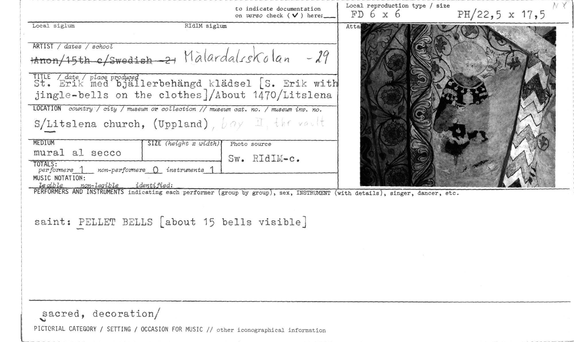 //// to indicate documentation on verso check (V ) //// Local reproduction type / size //// FD 6 x 6 PH/22,5 //// 5 //// Local siglum RIdIM siglum //// ARTIST / datas / school h å (ardctifs/C6 ta - 2? //// //// TITLE / date / place produced //// St. Erik med bjallerbehängd klädsel [S. Erik with jingle-bells on the clothes]/About 1470/Litslena //// LOCATION country' city / museum or collection // museum cat. no. / museum inv. no. //// S/Litslena church, (Uppland), //// MEDIUM //// mural al secco //// OTALS: //// per formers_l__ non-perfortners_a_ instruments 1 //// MUSIC NOTATION: //// Åtta //// SIZE (height x width) //// Photo source //// Sw. . //// 1 • 'de d: //// PE FOR ERS AND NSTRUMENTS //// indicating each performer group by group sex, INSTRUMENT (with details), singer, dancer, et //// saint: PELLET BELLS [about 15 Bells visible] //// sacred, decoration/ //// löbb //// PICTORIAL CATEGORY / SETTING / OCCASION FOR MUSIC // other iconographical information ////
