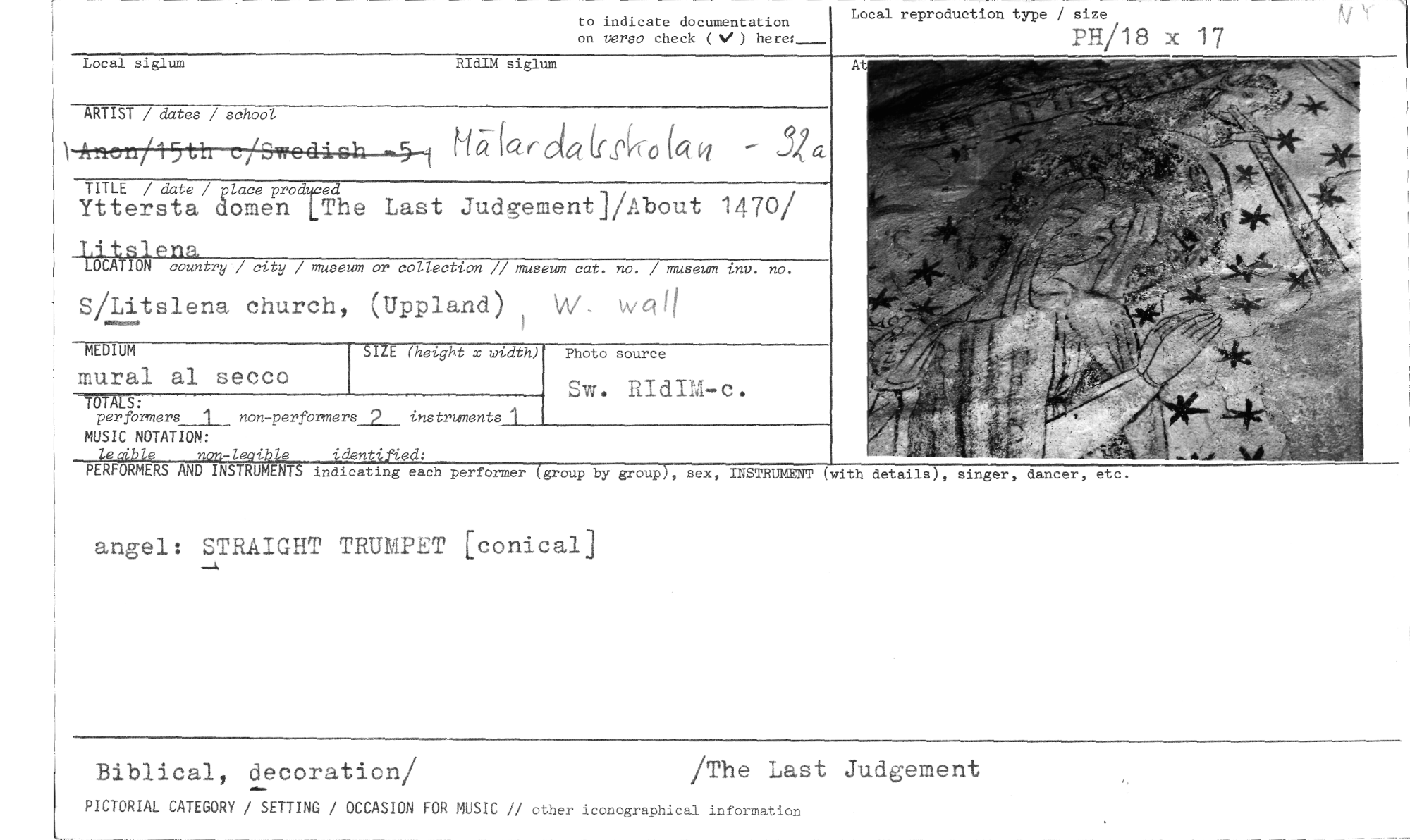 //// angel: STRAIGHT TRUMPET [conical] //// Biblical, decoration/ /The Last Judgement //// PICTORIAL CATEGORY / SETTING / OCCASION FOR MUSIC // other iconographical information //// to indicate documentation on versa check ( ) //// Local siglum RIdIM siglum //// ARTIST / dates / school //// r'. a lat r Ja( 2(4- 0 la - //// TITLE m //// date äolaceepnrodgced //// LThe Last Judgement]/About 1470/ Litslena //// LOCATION country / city / museum or collection // museum cat. no. / museum inv. no. //// S/Litslena church, (Uppland) W. //// Local reproduction type / size //// PH/18 x 17 //// MEDIUM //// SIZE (height x width) //// Photo source //// mural al secco //// TOTALS: //// per formers 1 non-performers2__ instruments 1 //// Sw. RIdIM-c. //// MUSIC NOTATION: //// leatible non-leaible //// PERFORMERS AND INSTRUMENTS indicating each performer (group by group), sex, //// INSTRUMENT (with details), singer, dancer, etc. ////