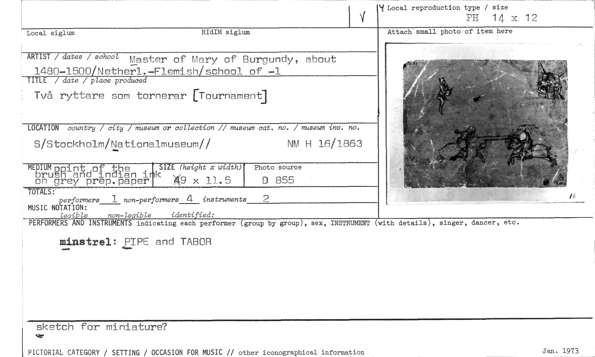 //// Local reproduction type / size //// PH 14 x 12 //// Attach small photo of item here //// Local siglum RIdIM siglum //// ARTIST / dater / school Master of Mary of Burgundy, ahout 148O-1500/Nether1.—Flemish/school of —1 //// TITLE / date / place produced //// Två ryttare som tornerar [Tournament] //// LOCATION country / city / museum or collection // museum cat. no. / museum inv. no. //// S/Stockholm/Nationalmuseum// NM H 16/1863 //// hommoo i //// int of the //// brunn and inoian in on grey prep.paper //// TALS: performers 1 non -performers 4 instruments 2 //// MUSIC NOTATION: //// legible non-legible identified: //// PERFORMERS AND INSTRUMENTS indicating each performer (group by group), sex, INSTRUMENT (with //// minstre1:2IPE and TABOR //// SIZE (height x width) //// k .9 x 11.5 //// Photo source //// D 855 //// details), singer, dancer, etc. //// sketch for miniature? //// mr //// PICTORIAL CATEGORY / SETTING / OCCASION FOR MUSIC // other iconographical information' //// Jan. 1973 ////
