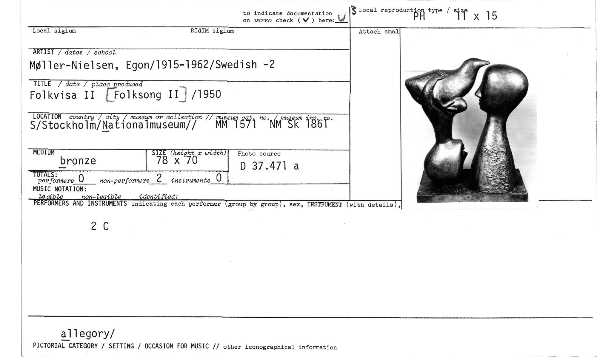 //// to indicate documentation //// on verso check (V) here:_ //// Local reproductill type / size //// IT x 15 //// Local siglum RIdIM siglum //// Attach smal //// ARTIST / dates / school //// M011er-Nielsen, Egon/1915-1962/Swedish -2 //// TITLE / date / place roduced //// Folkvisa II Folksong II /1950 //// LOCATION country / city / museum or collection // museum cat no. / museum Inr //// S/Stockholm/Nationalmuseum// MM 1571 NM Sk 186C. //// SIZE (height x width) //// 78 x 70 //// Photo source //// D 37,471 a //// MEDIUM //// bronze //// =An: //// per formers 0 non-perforners 2 instruments 0 //// MUSIC NOTATION: //// lecible non-leaible identified: //// PERFORMERS AND INSTRUMENTS indicating each performer (group by group), sex, //// INSTRUMENT (with details), //// 2 C //// allegory/ //// PICTORIAL CATEGORY / SETTING / OCCASION FOR MUSIC // other iconographical information ////