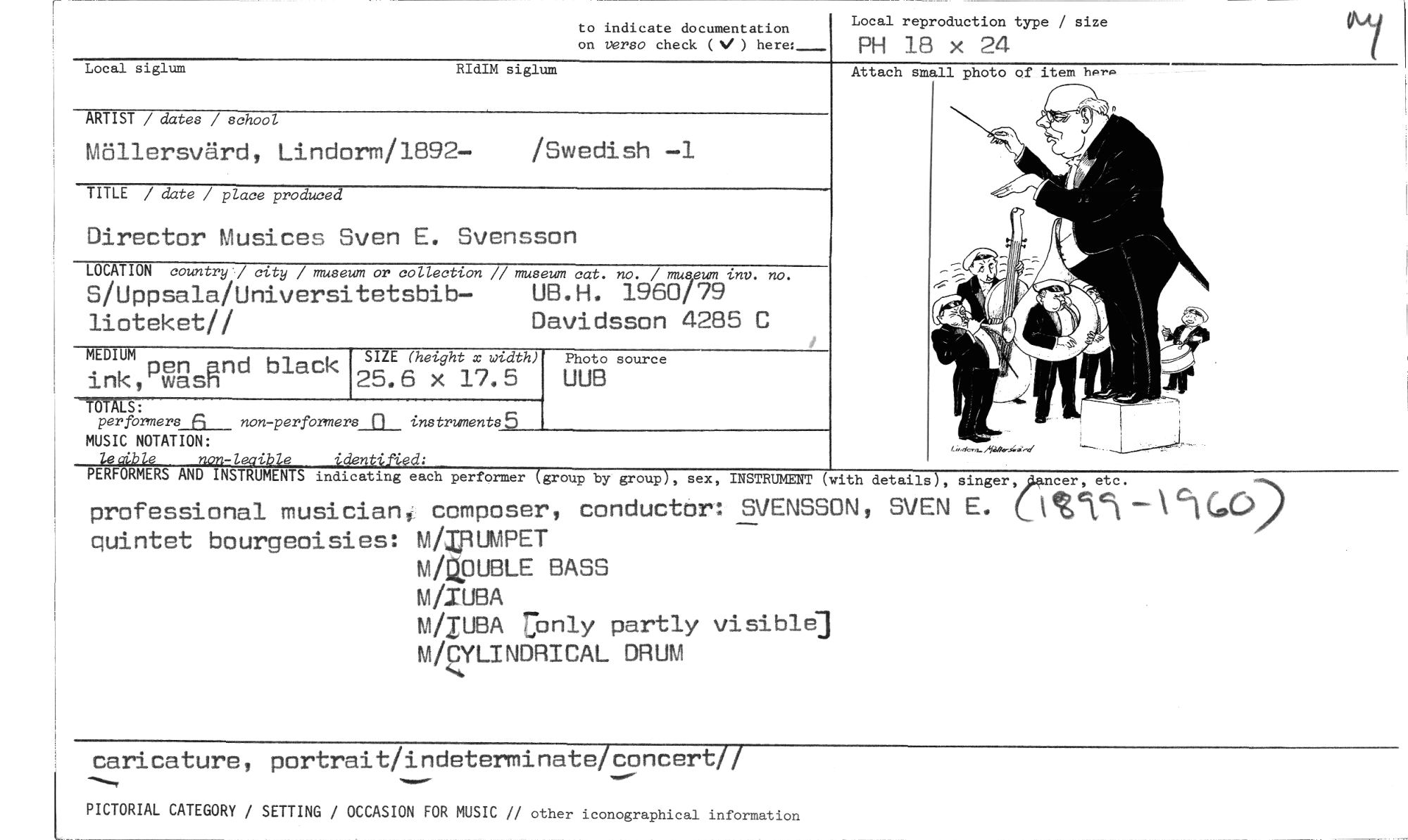 //// to indicate documentation //// on versa check (N/ ) here:_ //// Local reproduction type / size //// PH 18 x 24 //// Local siglum RIdIM s Slum //// ARTIST / dates / school //// Möllersvärd, Lindorm/1892— /Swedish —1 //// TITLE / date / place produced //// Director Musices Sven E. Svensson //// LOCATION country / city / museum or collection // museum cat. no. / mugg-24m viv. no. //// S/Uppsala/Universitetsbib— UB.H. 1960/79 //// lioteket// Davidsson 4285 C //// Attach //// MEDIUM //// pen and black ink, wasn //// SIZE (height x width) //// 25.6 x 17.5 //// Photo source //// UUB //// 1= //// performers_a___ non-performers_n_ instrurnents5 //// MUSIC NOTATION: //// ndicating each performer group by group , sex, INSTRUMENT (with details), s nger,i.ancer, etc. //// professional musician, composer, conductor: SVENSSON, SVEN E. 01K5c1 quintet bourgeoisies: M/IRUMPET //// M/QpUBLE BASS //// M/IUBA //// M/IUBA Uonly partly visible] //// M/ZyLINDRICAL DRUM //// caricature, portrait/indeterminate/concert// //// PICTORIAL CATEGORY / SETTING / OCCASION FOR MUSIC // other iconographical information //// AU e //// PERFORMERS AND INSTRUMENTS ////