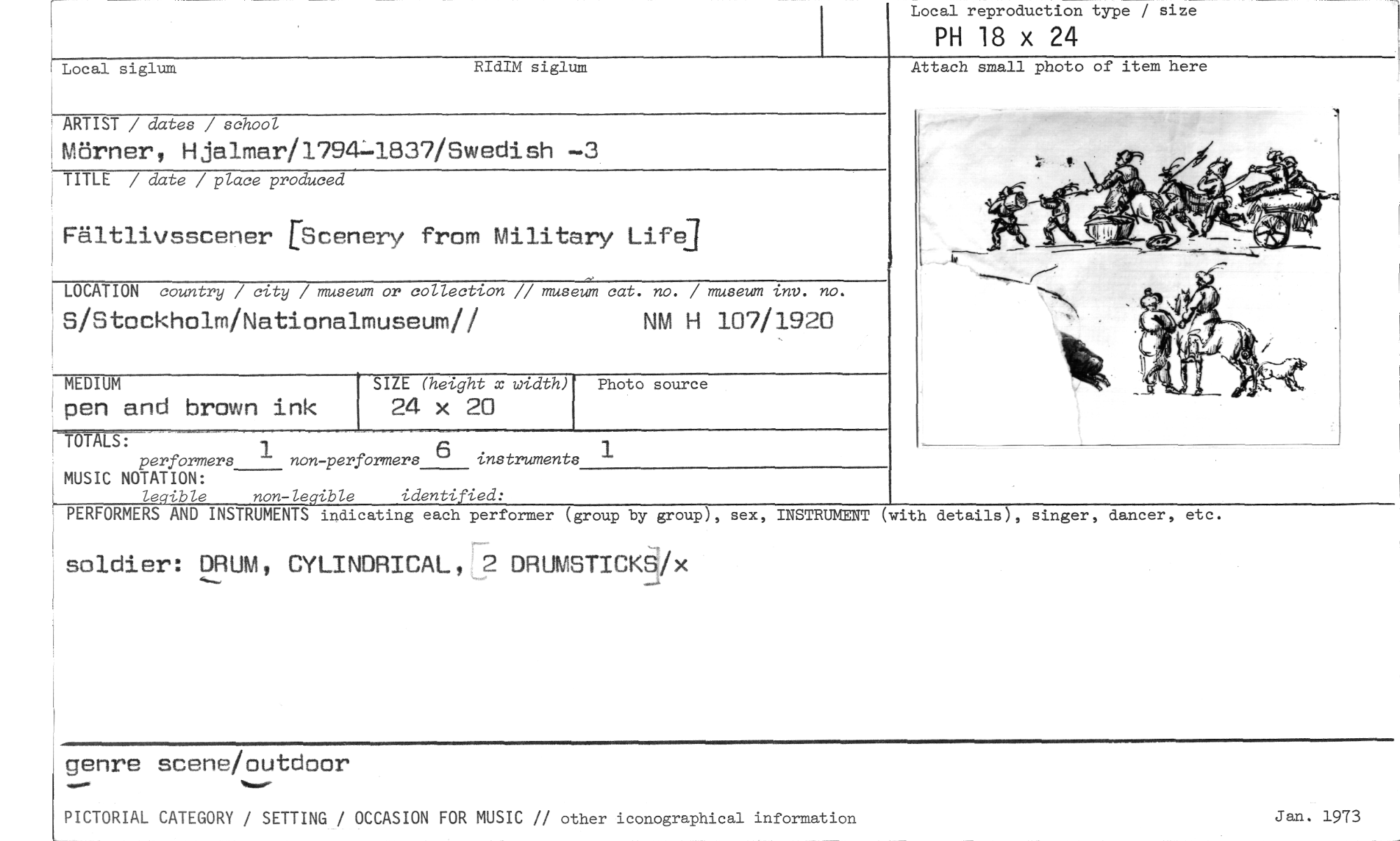 //// Local reproduction type / size //// PH 18 x 24 //// Attach small photo of item here //// Local siglum RIdIM siglum //// ARTIST / dates / school //// Mörner, Hjalmar/1794-1837/Swedish —3 //// TITLE / date / place produced //// Fältlivsscener EScenery from Military Life] //// LOCATION country / city / museum or collection // museum cat. no. / museum tnv. no. //// S/Stockholm/Nationalmuseum// NM H 107/1920 //// MEDIUM SIZE (height x width) Photo source //// pen and brown ink 24 x 20 //// //// TOTALS: performers 1 non-performers 6 instruments 1 //// MUSIC NOTATION: //// legible non-legible identified: //// PERFORMERS AND INSTRUMENTS indicating each performer (group by group), sex, INSTRUMENT (with details), singer, dancer, etc. //// soldier: DRUM, CYLINDRICAL 2 DRUMSTICKS/x //// genre scene/outdoor //// ^^^ //// PICTORIAL CATEGORY / SETTING / OCCASION FOR MUSIC // other iconographical information Jan. 1973 ////