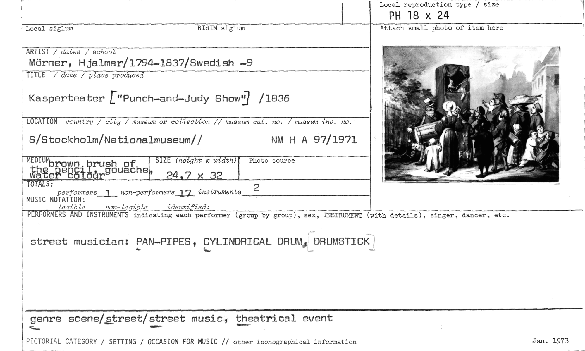 //// Attach small photo of item here //// Local siglum RIdIM siglum //// NM H A 97/1971 //// S/Stockholm/Nationalmuseum// //// Photo source //// SIZE (height x width) 24t7 x 32 //// KINK_ //// -orown.brush of the oencil gouache water coloår //// street musician: PAN—PIPES, CYLINDRICAL DRUM //// DRUMSTICK //// Jan. 1973 //// ographical information //// PICTORIAL CATEGORY / SETTING / OCCASION FOR MUSIC // other ico //// Local reproduction type / size //// PH 18 x 24 //// ARTIST / dates / school //// Mörner, Hjalmar/1794-1837/Swedish —9 //// TITLE / date / place produced //// Kasperteater r"Punch—and—Judy Show!'" /1836 //// LOCATION country / city / museum or collection // museum cat. no. / museum tnv. no. //// TOTALS: //// performers 1 non-performers_12 instruments //// MUSIC NOTATION: //// le•ible non-le•ible identi ied: //// PERFORMERS AND INSTRUMENTS indicating each performer (group by group), sex //// 2 //// (with details), singer, dancer, etc. //// INSTRUMENT //// genre scene/street/street music, theatrical event ////