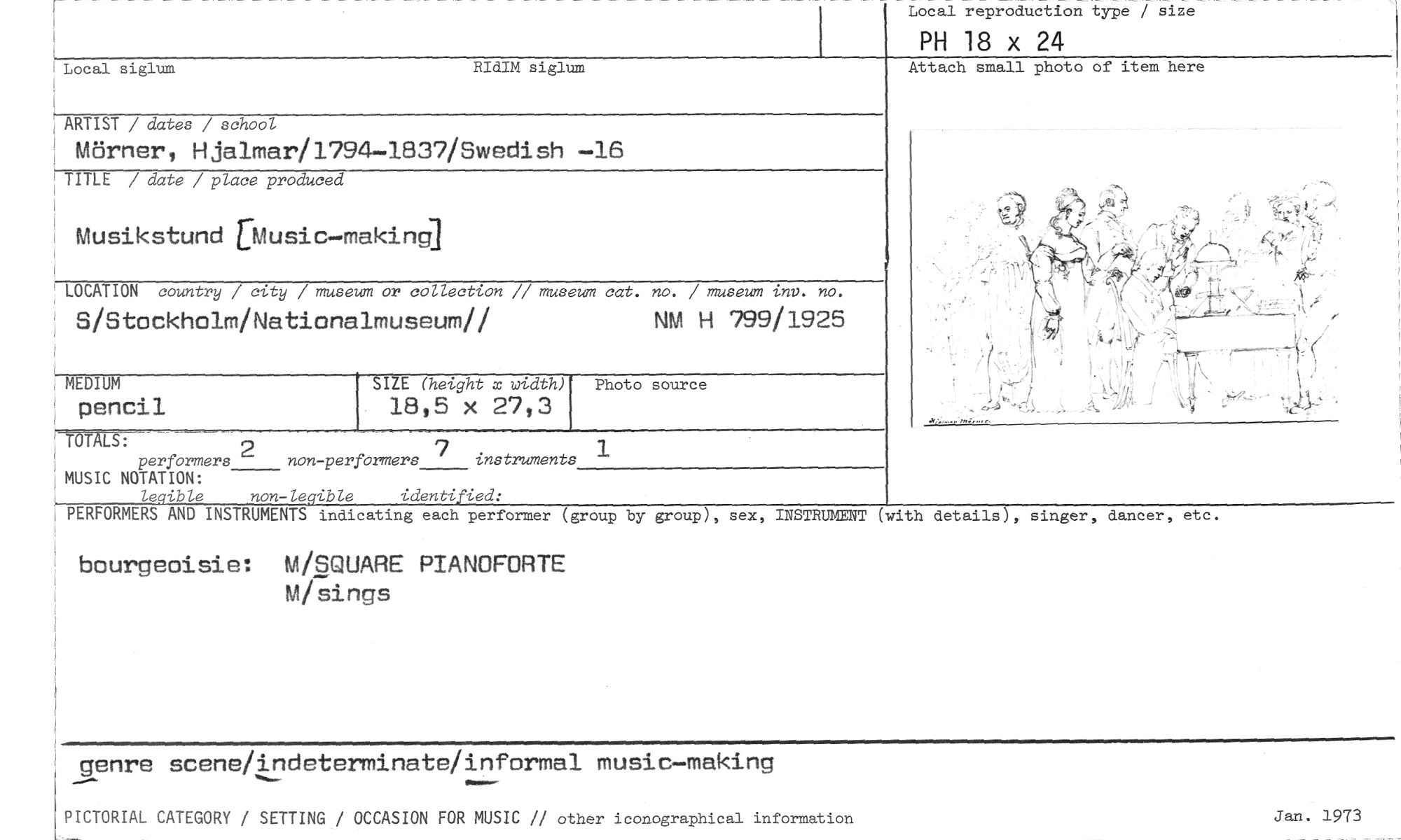 //// Local reproductiori type / size //// PH 18 x 24 //// Local siglum RIdIM siglum //// ARTIST / dates / school //// Mörner, Hjalmar/1794-1837/Swedish —16 //// TITLE / date / place produced //// MusikstundMusic—making] //// LOCATION country / city / museum or collection // museum cat. no. / museum tnv. no. //// S/Stockholm/Nationalmuseum// NM H 799/1925 //// SIZE (height x bndth) //// 18,5 x 27,3 //// Attach small photo of item here //// MEDIUM //// pencil //// Photo source //// urks: //// performers 2 non-performers 7 instruments 1 //// MUSIC NOTATION: //// legible non-legible identified: //// I PERFORMERS AND INSTRUMENTS indicating each performer (group by group), sex, INSTRUMENT (with details), singer, dancer, etc. //// bourgeoisie: M/SQUARE PIANOFORTE //// M/sings //// genre scene/indetarminate/informal music—making //// PICTORIAL CATEGORY / SETTING / OCCASION FOR MUSIC // other iconographical information Jan. 1973 ////
