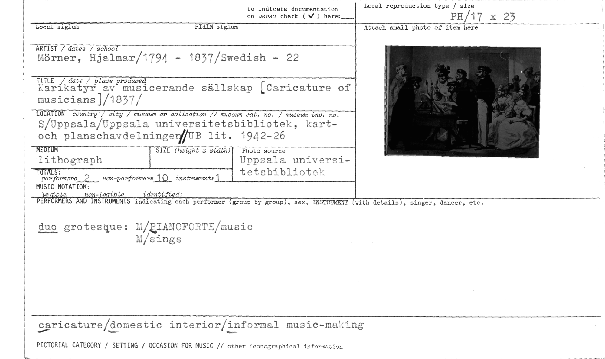 //// to indicate documentation on verso check (V ) //// Local reproduction type / size //// PH/17 x 23 //// Local siglum RIdIM siglum //// ARTIST / dates / school //// Mörner, Hjalmar/1794 - 1837/Swedish - 22 //// TITLE / date / place produced //// Karikatyr av musicerande sällskap [Caricature of musicians]/1837/ //// LOCATION country / city / museum or collection // museum cat. no. / museum inv. no. //// S/Uppsala/Uppsala universitetsbibliotek, kart-och planschavdelninger0 lit. 1942-26 //// SIZE (height x tebdth) //// TOTALS: //// per formers 2 non-perfOrmersAje instruments1 //// MUSIC NOTATION: //// AU 'f //// -1 e 'de 'ed: //// MEDIUM //// lithograph //// Photo source //// Uppsala universitetsbibliotek //// Attach small photo of item here //// PERFORMERS AND INSTRUMENTS indicating each performer group by group , sex, INSTRUMENT (with de alls), singer, dancer, et //// duo grotesque: M/WANOPORTE/music //// M/sings //// caricature/domestic interior/informal music-making //// PICTORIAL CATEGORY / SETTING / OCCASION FOR MUSIC // other iconographical information ////