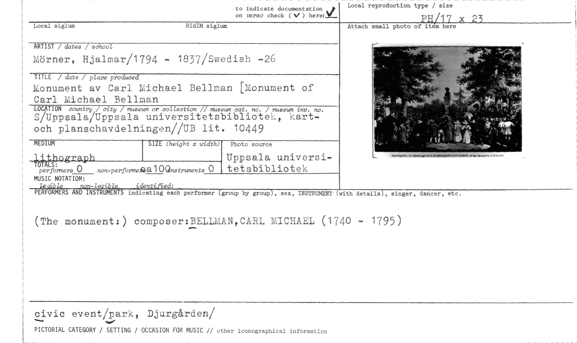 //// to indicate documentation njp on versa check ( ) //// Local reproduction type / size //// PHALJ_c 23 //// Local siglum RIdIM siglum //// Attach small photo of item here //// ARTIST / dates / school //// Mörner, Hjalmar/1794 - 1837/Swedish -26 //// TITLE / date / place produced //// Monument av Carl Michael Bellman [Monument of Carl Michael Bellman //// LOCATION countryjcity / museum or collection // museum cat. no. / museum inb. no. //// S/Uppsala/Uppsala universitetsbibliotek, kart-och planschavdelningen//UB lit. 10449 //// MEDIUM SIZE (height x width) Photo source //// Ath°g"Ph //// LS: Uppsala universi //// performers 0 non-perfomnefaa100nstruments 0 tetsbibliotek //// MUSIC NOTATION: //// letikle non-leaible identified: //// PERFORMERS AND INSTRUMENTS indicating each performer (group by group), sex, INSTRUMENT (with details), singer, dancer, etc. //// (The monument:) composer:BELLMAN,CARL MICHAEL (1740 - 1795) //// civic event/park, Djurgården/ //// PICTORIAL CATEGORY / SETTING i'OCCASION FOR MUSIC // other iconographical information ////