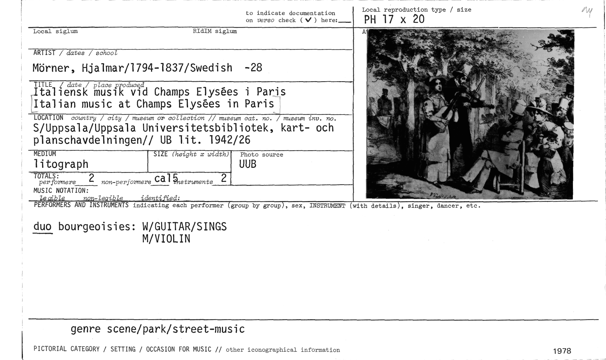 //// to indicate documentation Local reproduction type / size //// on verso check (V ) here:_ PH 17 >( 20 //// indicating each performer (group by group), sex, INSTRUMENT (with //// Local siglum RIdIM siglum //// ARTIST / dates / school //// Mörner, Hjalmar/1794-1837/Swedish 28 //// TITLE l date / place produced //// Italiensk musik vid Champs ElyAes i Paris Italian music at Champs ElyAes in Paris //// LOCATION country / city / museum or collection // museum cat. no. / museum inv. no. //// S/Uppsala/Uppsala Universitetsbibliotek, kart- och planschavdelningen// UB lit. 1942/26 //// SIZE (height x width) //// TOTALS: //// perfbrmers 2 non-performers "1 struments 2 //// MUSIC NOTATION: //// lecrible non-legible identified: //// PERFORMERS AND INSTRUMENTS //// details), singer, dancer, etc. //// MEDIUM //// litograph //// Photo source //// UUB //// duo bourgeoisies: W/GUITAR/SINGS //// M/VIOLIN //// genre scene/park/street-music //// PICTORIAL CATEGORY / SETTING / OCCASION FOR MUSIC // other iconographical information 1978 ////