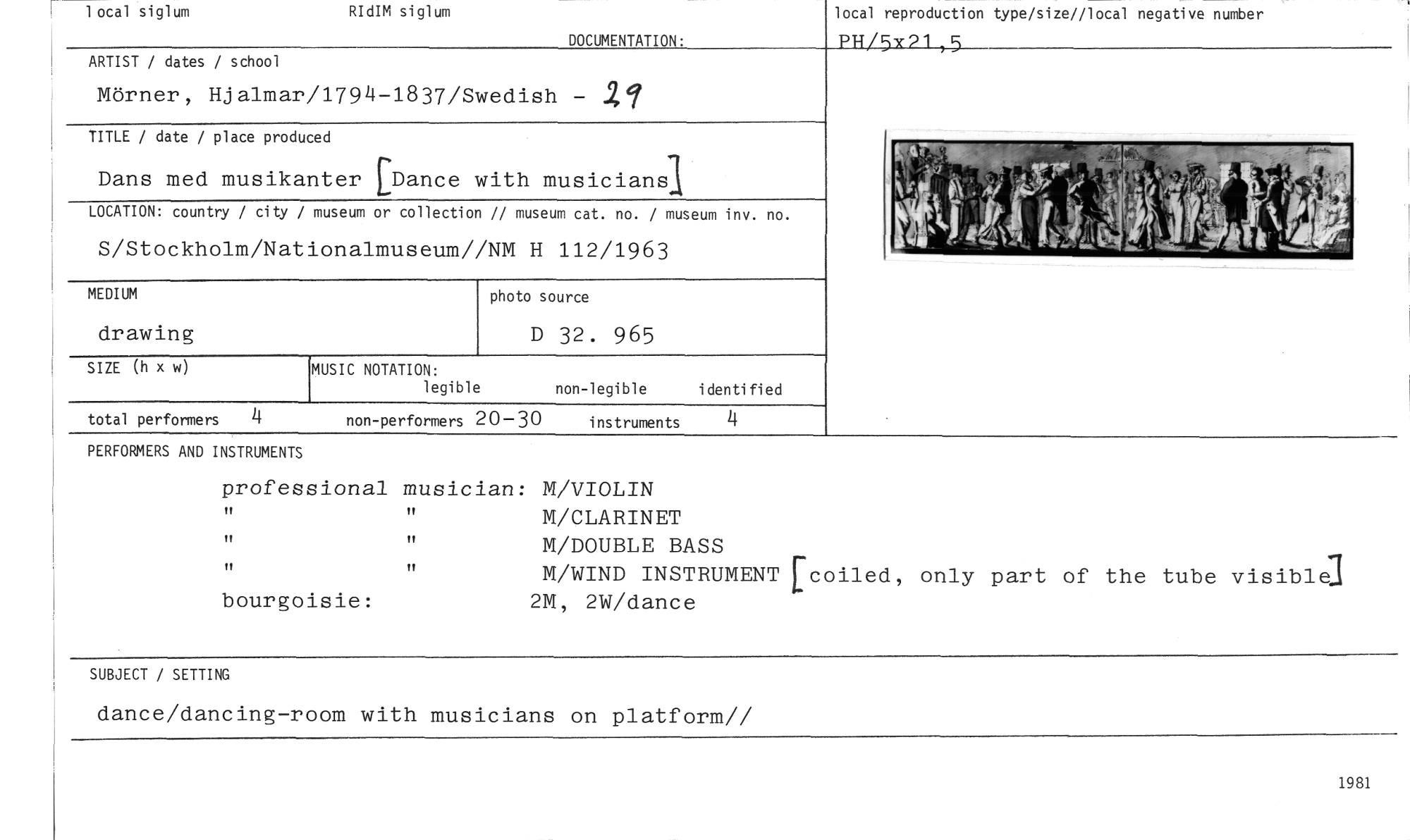 //// 1 ocal siglum RIdIM siglum //// local reproduction type/size//local negative number //// PH/5x21 ,5 //// DOCUMENTATION: //// ARTIST / dates / school //// Mörner, Hjalmar/1794-1837/Swedish - 29 //// TITLE / date / place produced //// Dans med musikanter [Dance with musicians //// LOCATION: country / city / museum or collection // museum cat. no. / museum i nv. no. //// S/Stockholm/Nationalmuseum//NM H 112/1963 //// MEDIUM //// photo source //// drawing //// D 32. 965 //// SIZE (h x w) //// MUSIC NOTATION: //// legible non-legible i denti fi ed //// total performers 4 non-performers 20-30 instruments 4 //// PERFORMERS AND INSTRUMENTS //// professional musician: M/VIOLIN //// M/CLARINET //// M/DOUBLE BASS //// M/WIND INSTRUMENT [coiled, only part of the tube visible] bourgoisie: 2M, 2W/dance //// SUBJECT / SETTING //// dance/dancing-room with musicians on platform// //// 1981 ////