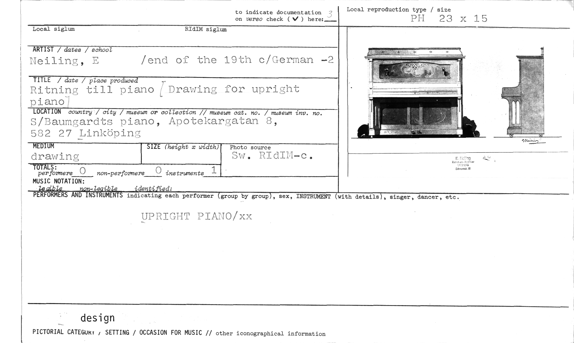 //// to indicate documentation 3 on verso check (V) here:_--- //// Local reproduction type / size //// PH 23 x 15 //// Local siglum RIdIM siglum //// ARTIST / date: / school //// Neiling, E /end of' the 19th c/German - //// TITLE / date / place produced //// Ritning till piano [Drawing for upriht //// piano7 //// LOCATION country / city / museum or collection // museum cat. no. / museum inv. no. //// S/Baumgardts piano, Apotekargatan 8, 582 27 Linköping //// MEDIUM //// drawing //// SIZE (height x width) //// Photo source //// Sw. RIdIM-c. //// -TOTAB: //// er 0 non-performers 0 instruments //// MUSIC NOTATION: //// 404Ple nnp-legikle identified: //// PER ORMERS AND INSTRUMENTS indicating each performer (group by group), sex, INSTRUMENT //// UPRIGHT PIANO/xx //// (with details), singer, daner, etc. //// design //// PICTORIAL CATEGum i SETTING / OCCASION FOR MUSIC // other iconographical information ////