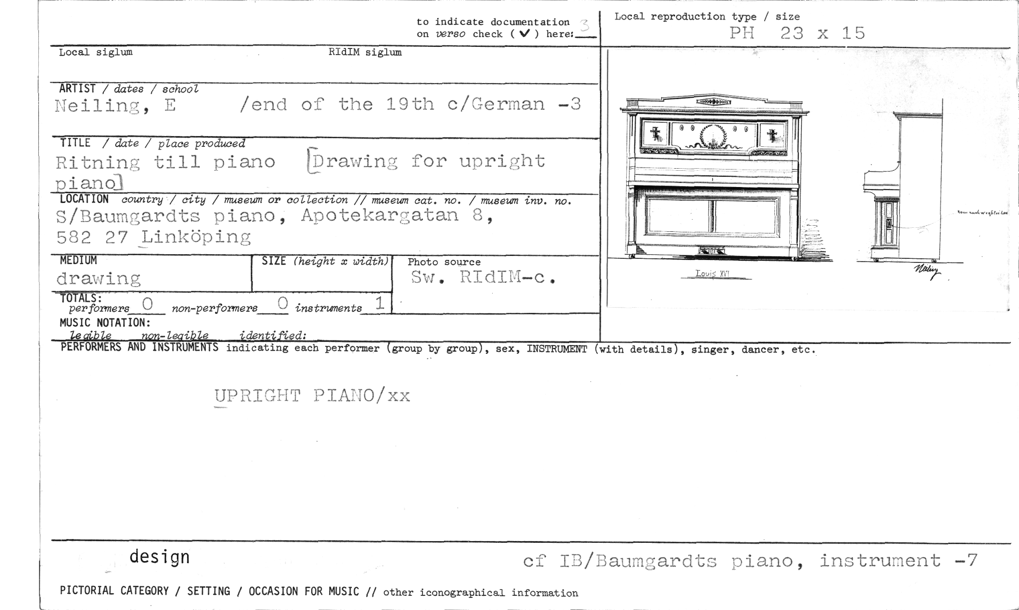 //// to indicate documentation //// on verso check (V) here:_r_ //// Local reproduction type / size //// PH 23 x 15 //// Local siglum RIdIM siglum //// ARTIST / dates / school //// Neiling, E /end of the 19th c/German -3 //// TITLE / date / place produced //// Ritning till piano [Drawing for upright piano] //// LOCATION country / city / museum or collection // museum cat. no. / museum inv. no. //// S/Baumgardts piano, Apotekargatan 8, 582 27 Linköping //// SIZE (height x width) //// Sw. RIdIM-e. //// TOMS: //// per forners 0 non-perfortners 0 instruments //// MUSIC NOTATION: //// ar -Z-•i. 'den 'ed: //// MEDIUM //// drawing //// Photo source //// w.ON, //// PE FORMERS AND INSTRUMENTS indicating each performer group by group , sex, INSTRUMENT (with details , singer, dancer, etc. //// UPRIGHT PIANO/xx //// design of IB/Baumgardts piano, instrument -7 //// PICTORIAL CATEGORY / SETTING / OCCASION FOR MUSIC // other iconographical information ////