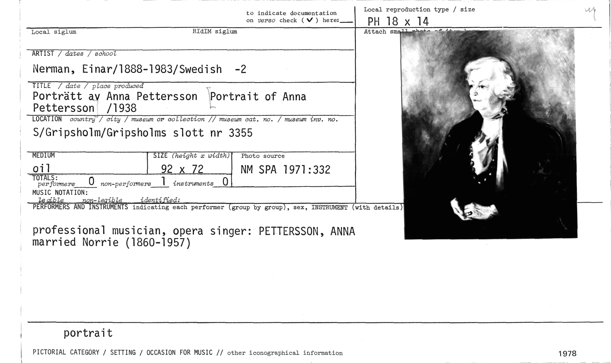 //// to indicate documentation //// on versa check (V ) here:_ //// Local reproduction type / size //// PH 18 x 14 //// Local siglum RIdIM siglum //// ARTIST / dates / school //// Nerman, Einar/1888-1983/Swedish -2 //// TITLE / date / place produced //// Porträtt av Anna Pettersson Portrait of Anna Pettersson /1938 //// LOCATION country / city / museum or collection // museum cat. no. / museum inv. no. //// S/Gripsholm/Gripsholms slott nr 3355 //// Attach sm //// MEDIUM //// SIZE (height x width) //// oil 92 x 72 //// TOTALS: //// per formers n non-per formers 1 instruments 0 //// NM SPA 1971:332 //// MUSIC NOTATION: //// lecrible non-leaible //// PERFORMERS AND INSTRUMENTS indicating each performer (group by group-Y, //// sex, INSTRUMENT (with details //// professional musician, opera singer: PETTERSSON, ANNA married Norrie (1860-1957) //// Photo source //// portrait //// PICTORIAL CATEGORY / SETTING / OCCASION FOR MUSIC // other iconographical information //// 1978 ////