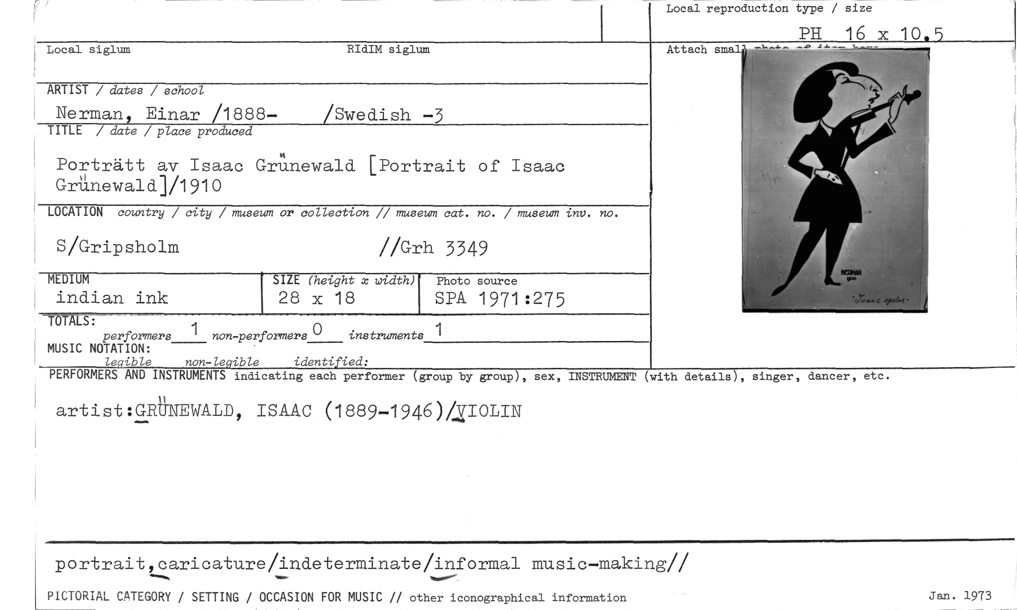 //// Local reproduction type / size //// PH 16 x 10.5 //// Attach smal //// Local siglum RIdIM siglum //// ARTIST / dates / school //// Nerman, Einar /1888- /Swedish -3 //// TITLE / date / place produced //// Porträtt av Isaac GrUnewald [Portrait of Isaac Grlinewald]/1910 //// LOCATION country / city / museum or collection // museum cat. no. / museum inv. no. //// S/Gripsholm //Grh 3349 //// MEDIUM SIZE (height x width) Photo source //// indian ink 28 x 18 SPA 1971:275 //// //// TOT LS: //// performers 1non-performers ° instruments //// MUSIC NOTATION: //// legible non-legible identified: //// PERFORMERS AND INSTRUMENTS indicating each performer (group by group), sex, INSTRUMENT (with details), singer, dancer, etc. //// artist:GRUNEWALD, ISAAC (1889 -1946)/VIOLIN //// 1 //// portrait,caricature/indeterminate/informal music-making// //// PICTORIAL CATEGORY / SETTING / OCCASION FOR MUSIC // other iconographical information //// Jan. 1973 ////