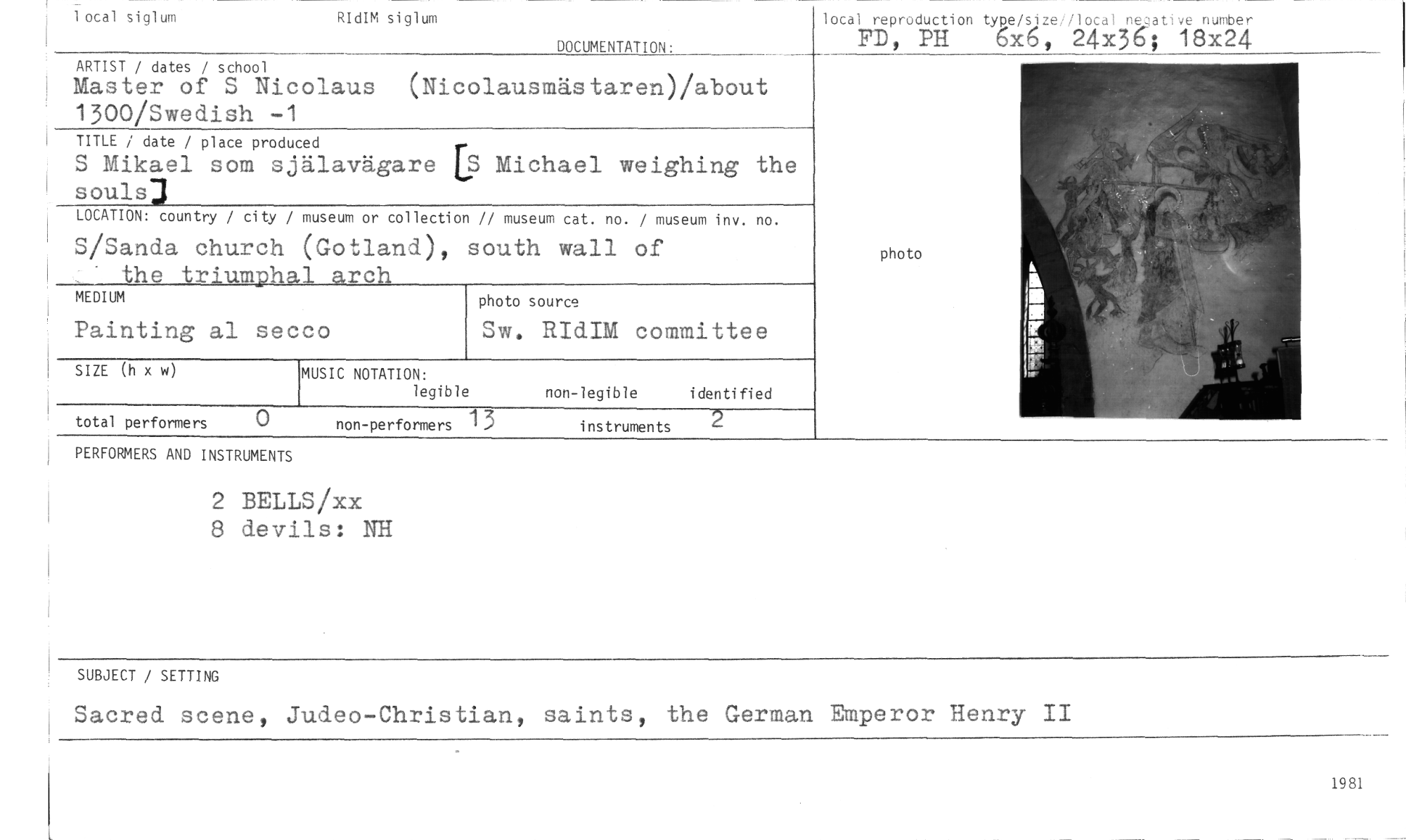 //// DOCUMENTATION: //// local reproduction type/size//local negative number //// PD, PH 6x6, 24x36; 18x24 //// 1 ocal siglum RIdIM siglum //// ARTIST / dates / school //// Master of S Nicolaus (Nicolausmästaren)/about //// 1300/Swedish -1 //// TITLE / date / place produced //// S Mikael som själavägare [p Michael weighing the //// souls] //// LOCATION: country / city / museum or collection // museum cat. no. / museum inv. no. //// S/Sanda church (Gotland), south wall of the triumphal arch //// photo source //// Sw. RIdIM committee //// SIZE (h x w) //// total performers 0 non-performrs 13 instruments 2 //// photo //// MEDIUM //// Painting al secco //// MUSIC NOTATION: //// legible non-legible identified //// PERFORMERS AND INSTRUMENTS //// 2 BELLS/xx //// 8 devils: NH //// SUBJECT / SETTING //// Sacred scene, Judeo-Christian, saints, the German Emperor Henry II //// 19 81 ////