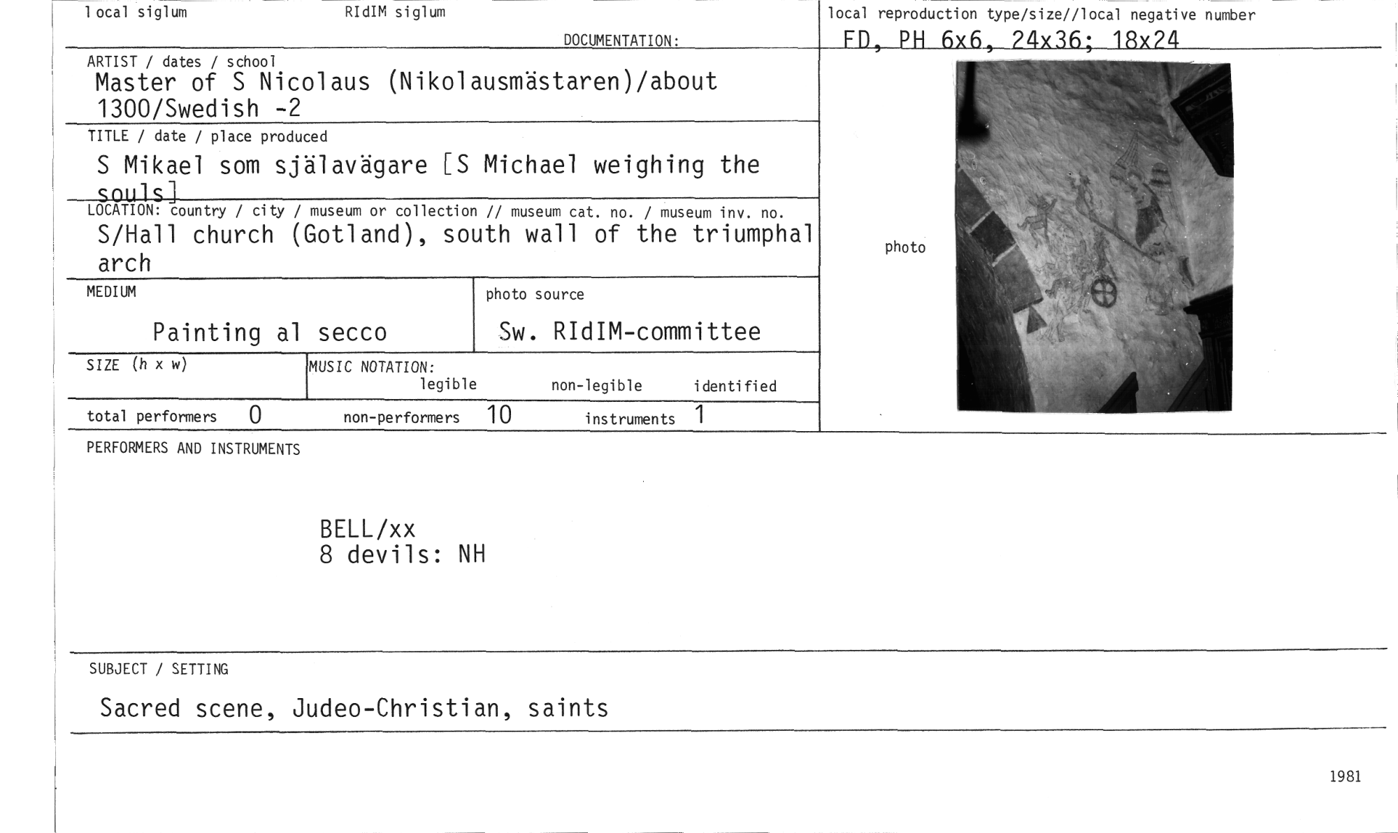 //// 1 ocal siglum //// RIdIM siglum //// DOCUMENTATION: //// local reproduction type/size//local negative number //// ED. PH 6x6 ?4x36: 18x24 //// ARTIST / dates / school //// Master of S Nicolaus (Nikolausmästaren)/about 1300/Swedish -2 //// TITLE / date / place produced //// S Mikael som själavägare [S Michael weighing the souls] //// LOCATION: country / city / museum or collection // museum cat. no. / museum inv. no. //// S/Hall church (Gotland), south wall of the triumphal arch //// MEDIUM //// Sw. RIdIM-committee //// SIZE (h x w) //// total performers 0 non-performers 10 instruments 1 //// Painting al secco //// MUSIC NOTATION: //// legible non-legible i denti fi ed //// photo source //// photo //// PERFORMERS AND INSTRUMENTS //// BELL/xx //// 8 devils: NH //// SUBJECT / SETTING //// Sacred scene, Judeo-Christian, saints //// 1981 ////