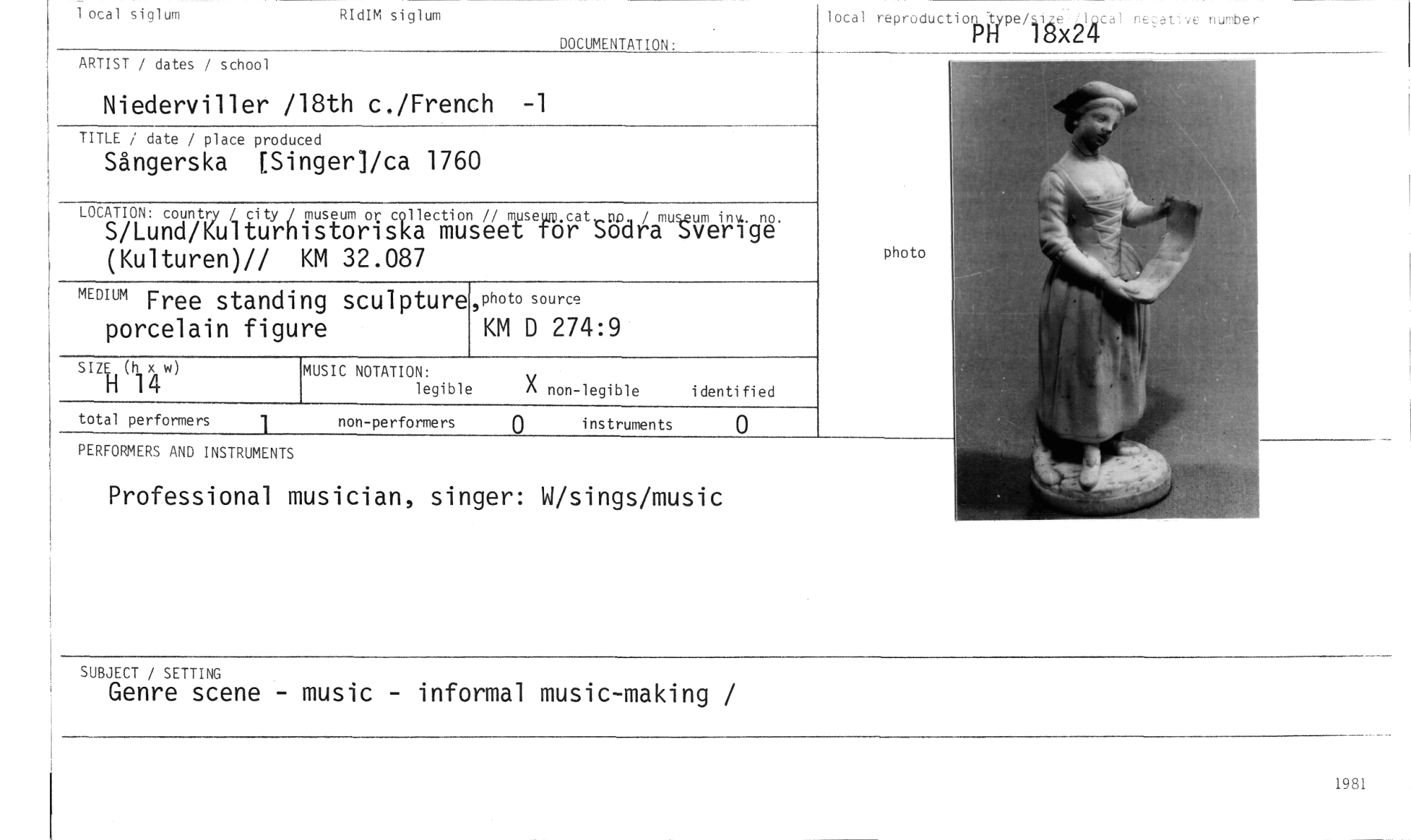 //// 1 ocal siglum //// RIdIM siglum //// DOCUMENTATION: //// lotal reproductiogype/I WeLVÄe ve nurober //// LF //// ARTIST / dates / school //// Niederviller /18th c./French -1 //// TITLE / date / place produced //// Sångerska (Singerlica 1760 //// LOCATION: country / city/ museum or collection // muse //// S/Lund/Kulturhistoriska museet (Kulturen)// KM 32.087 //// uktsudi.ä-uvr14. //// photo //// MEDIUM Free standing sculpture porcelain figure //// ,photo source //// KM D 274:9 //// MUSIC NOTATION: //// legible //// X non-legible i denti fi ed //// 0 //// PERFORMERS AND INSTRUMENTS //// Professional musician, singer: W/sings/music //// SUBJECT / SETTING //// Genre scene - music - informal music-making / //// 1981 ////