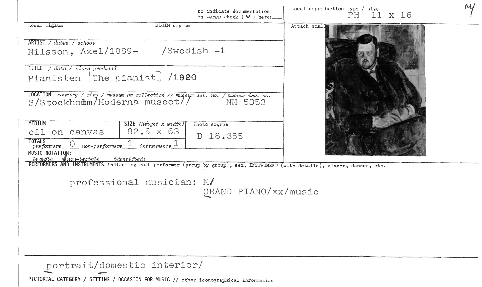 //// -TOTALS: //// per formers 0 non-performers 1 instruments //// MUSIC NOTATICW: //// leakble 4non-leaible identif4ed: //// PERFoRMERS AND INSTRUMENTS indicating each performer (group //// Local siglum RIdIM siglum //// ARTIST / dates / school //// Nilsson, Axel/1889- /Swedish -1 //// TITLE / date / place produced //// Pianisten The pianist] /1900 //// LOCATION country] ett / museum or collection // museum cat. no. / museum tnv. no. //// S/Stockhodim/Moderna museet// NM 5353 //// MEDIUM //// oil on canvas //// SIZE (height x width) Photo source //// 82.5 x 63 //// D 18.355 //// to indicate documentation //// on verso check (V) here: //// by group), sex, INSTRUMENT (with details), singer, dancer, etc. //// PH 11 x 16 //// Attach smal //// Local reproduction type / size //// professional musician: Ml //// GRAND PIANO/xx/music //// portrait/domestic interior/ //// .4."- //// PICTORIAL CATEGORY / SETTING / OCCASION FOR MUSIC // other iconographical information ////