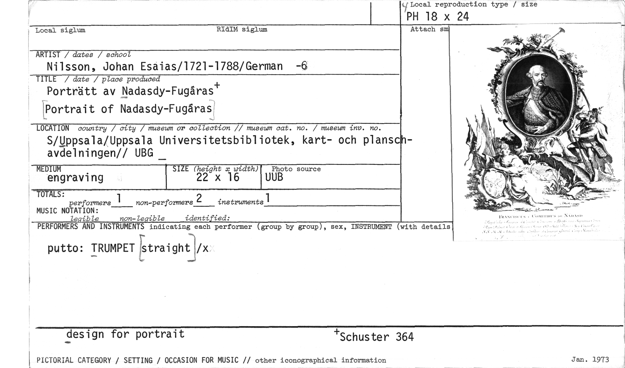 //// 5(Local reproduction type / size //// PH 18 x 24 //// Local siglum RIdIM siglum //// Attach sm //// ARTIST / dates / school //// Nilsson, Johan Esaias/1721-1788/German //// TITLE / date / place produced //// Porträtt av Nadasdy-Fugåras , //// iPortrait of Nadasdy-Fugåras //// LOCATION country / city / museum or collection // museum cat. no. / museum tnv. no. //// S/Uppsala/Uppsala Universitetsbibliotek, kart- och planschavdelningen// UBG _ //// TOT'LS: //// performers //// MUSIC NOTATION: //// legible non-legible identified: //// PERFORMERS AND INSTRUMENTS indicating each performer (group by group), sex, INSTRUMENT (with details //// instruments) //// 1 non-performers 2 //// putto: TRUMPET straight /x //// design for portrait //// +Schuster 364 //// PICTORIAL CATEGORY / SETTING / OCCASION FOR MUSIC // other iconographical information //// Jan. 1973 //// ugto source //// MEDIUM //// engraving //// SIZE (height x width) //// 22 x 16 ////