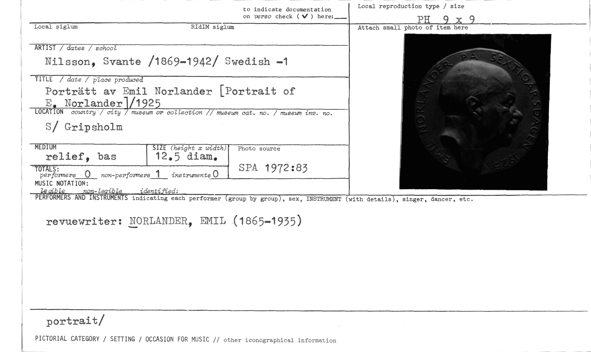 //// to indicate documentation on verso check (V ) //// Local siglum RIdIM siglum //// ARTIST / dates / school //// Nilsson, Svante /1869-1942/ Swedish —1 //// TITLE / date / place produced //// Porträtt av Emil Norlander [Portrait of //// E. Norlander1/1925 //// LOCATION country / city / museum or collection // museum cat. no. / museum inv. no. //// S/ Gripsholm //// Photo source //// TOTALS //// perfbrners 0 non-performers 1 instruments 0 //// MUSIC NOTATION: //// leaible non-leaible Local reproduction type / size //// Pli 9 x 9 //// Attach small photo of item here //// MEDIUM //// relief, bas //// SIZE (height x width) //// 12.5 diam. //// SPA 1972:83 //// PERFORMERS AND INSTRUMENTS indicating each performer (group by group), sex, INSTRUMENT (with details), singer, dancer, etc. //// revuewriter: NORLANDER, EMIL (1865-1935) //// portrait/ //// PICTORIAL CATEGORY / SETTING / OCCASION FOR MUSIC // other iconographical information ////