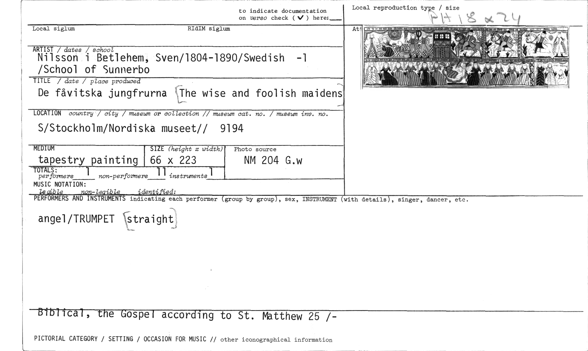 //// Local reproduction type / size //// to indicate documentation //// on versa check (V ) here:_ //// Local siglum RIdIM siglum //// ARTIST / dates / school //// Nilsson i Betlehem, Sven/1804-1890/Swedish -1 /School of Sunnerbo //// TITLE / date / place produced //// De fåvitska jungfrurna The wise and foolish maidens //// LOCATION country'/ city / museum or collection // museum cat. no. / museum inv. no. //// S/Stockholm/Nordiska museet// 9194 //// MEDIUM //// tapestry painting //// IT LS: //// per formers //// MUSIC NOTATION: //// SIZE (height x width) //// 66 x 223 //// instruments //// non -perfOrmers //// Photo source //// NM 204 G.w //// e //// 4i-1-•ip e 'lent' //// e //// PERFORMERS AND INSTRUMENTS indicating each performer group by group , sex, INSTRUMENT (with details), singer, dancer, etc. //// angel/TRUMPET \-Straight //// Bibllcal, the Gospel according to St. Matthew 25 /- //// PICTORIAL CATEGORY / SETTING / OCCASION FOR MUSIC // other iconographical information //// _ ////