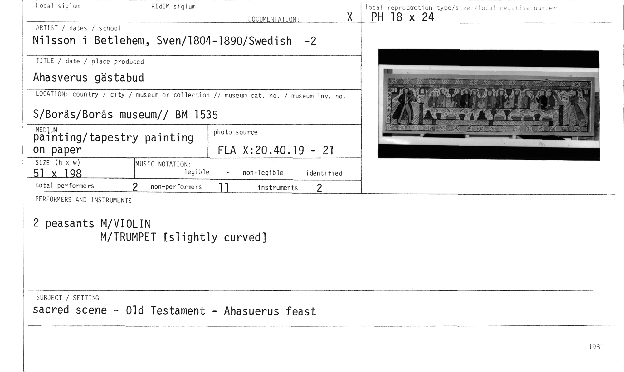 //// e nurober //// local siglum RIdIM siglum //// DOCUMENTATION• //// local reproduction type/size,/local nega //// PH 18 x 24 //// ARTIST / dates / school //// Nilsson i Betlehem, Sven/1804-1890/Swedish -2 //// TITLE / date / place produced //// Ahasverus gästabud //// LOCATION: country / city / museum or collection // museum cat. no. / museum inv. no. //// S/Borås/Borås museum// BM 1535 //// photo source //// FLA X:20.40.19 - 21 //// MEDIUM //// painting/tapestry painting on paper //// MUSIC NOTATION: //// legible non-legible identified //// SIZE (h x w) //// 51 x 198 //// total performers //// instruments //// 2 non-performers 11 //// 2 //// 2 peasants M/VIOLIN //// M/TRUMPET Eslightly turved] //// PERFORMERS AND INSTRUMENTS //// SUBJECT / SETTING //// sacred scene - Old Testament - Ahasuerus feast //// 1981 ////