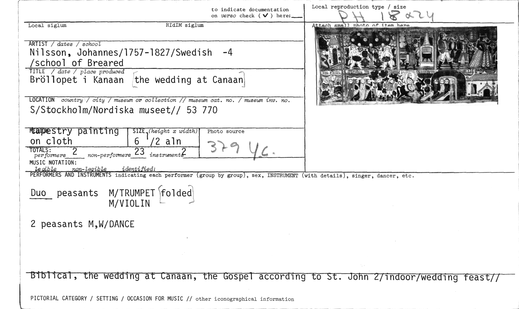 //// Local reproduction type / size //// Vt I e //// nbm-, nf //// to indicate documentation //// on versa check (V ) here:_ //// Local siglum RIdIM siglum //// ARTIST / dates / school //// Nilsson, Johannes/1757-1827/Swedish -4 /school of Breared //// TITLE / date / place produced //// Bröllopet i Kanaan the wedding at Canaani //// LOCATION country / city / museum or collection // museum cat. no. / museum inv. no. //// S/Stockholm/Nordiska museet// 53 770 //// SIZE,(height x width) //// 6 /2 aln //// MALS: //// per formers 9non-performers 23 instrument? MUSIC NOTATION: //// lectb/e non-leaible identified; //// PERFORMERS AND INSTRUMENTS indicating each performer (group by //// mapestry painting on cloth //// Photo source //// 3)-4) //// group), sex, INSTRUMENT (with details), singer, dancer, etc. //// Duo peasants M/TRUMPEVfolded' M/VIOLIN //// 2 peasants M,W/DANCE //// ic e we ing a anaan, ospe accorsing o n in•oor we ing eas 7--- //// PICTORIAL CATEGORY / SETTING / OCCASION FOR MUSIC fl other iconographical information ////