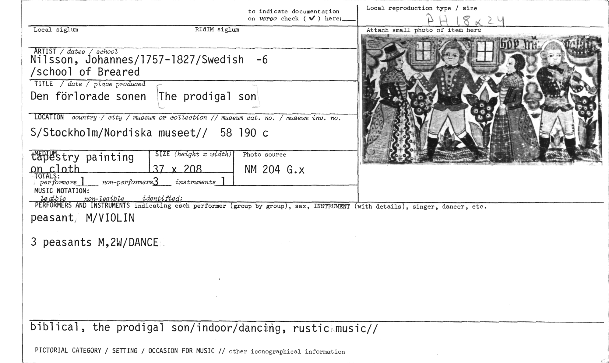 //// (group by group), sex, INSTRUMENT (with //// details), singer, dancer, etc. //// to indicate documentation //// on verso check (N/ ) here:_ //// Local reproduction type / size //// r //// Local siglum RIdIM siglum //// ARTIST / dates / school //// Nilsson, Johannes/1757-1827/Swedish -6 /school of Breared //// LOCATION country / city / museum or collection // museum cat. no. / museum inv. no. //// S/Stockholm/Nordiska museet// 58 190 c //// täVelstry painting SIZE (height x width) //// f)r) s,1 nth 37 Y 202 //// TOTALS: //// per formers 1 non-performers3___ instruments 1 //// MUSIC NOTATION: //// leaible non-leaibie identified; //// PERFORMERS AND INSTRUMENTS indicating each performer //// peasant M/VIOLIN //// 3 peasants M,2W/DANCE, //// biblical, the prodigal son/indoor/dancifig, rustic music// //// PICTORIAL CATEGORY / SETTING / OCCASION FOR MUSIC // other iconographical information //// Photo source //// NM 204 G.x //// Attach small photo of item here //// TITLE / date / place produced //// Den förlorade sonen 'The prodigal son ////