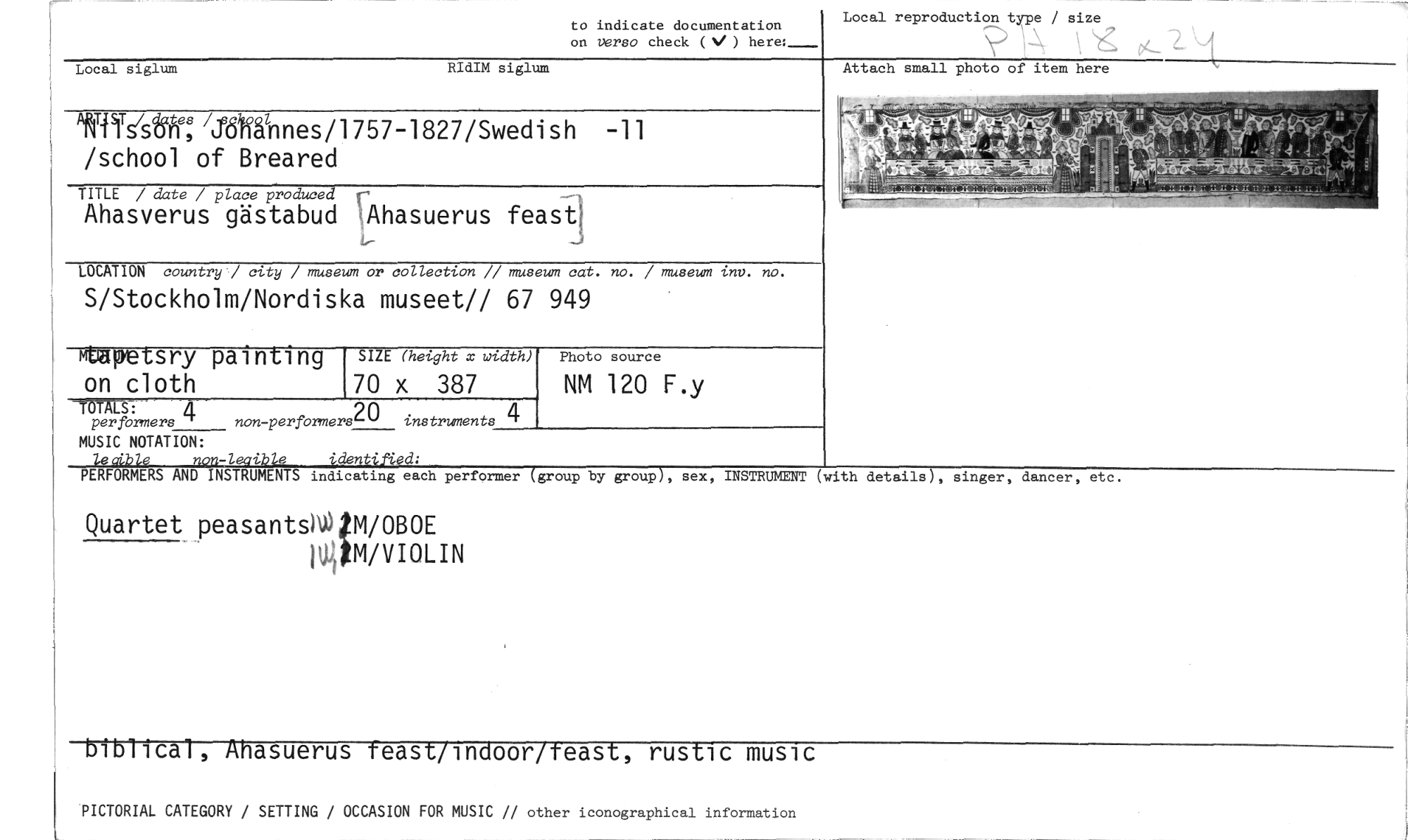//// rLocal siglum RIdIM siglum //// Local reproduction type / size //// to indicate documentation //// on versa check (%, ) here:_ //// Attach small photo of item here //// AfITPITs/sM: Stiålnnes/1757-1827/Swedish -11 /school of Breared //// TITLE / date / place produced r //// Ahasverus gästabud =Ahasuerus feast'i //// LOCATION country / city / museum or collection // museum cat. no. / museum inv. no. //// S/Stockholm/Nordiska museet// 67 949 //// mapretsry painting on cl oth //// SIZE (height x width) //// 70 x 387 //// Photo source //// NM 120 F.y //// TOTALS: //// per formers non-perforners20 instruments //// MUSIC NOTATION: //// -•• - •• l-•-t• e 'de //// PERFORMERS AND NSTRUMENTS indicating each performer group by group sex, INSTRUMENT (with details), singer, dance , etc. //// Quartet peasants».1):M/OBOE //// OM/VIOLIN //// biblical , asuerus eas in•oor eas , rus ic music //// PICTORIAL CATEGORY / SETTING / OCCASION FOR MUSIC // other iconographical information //// 4 ////