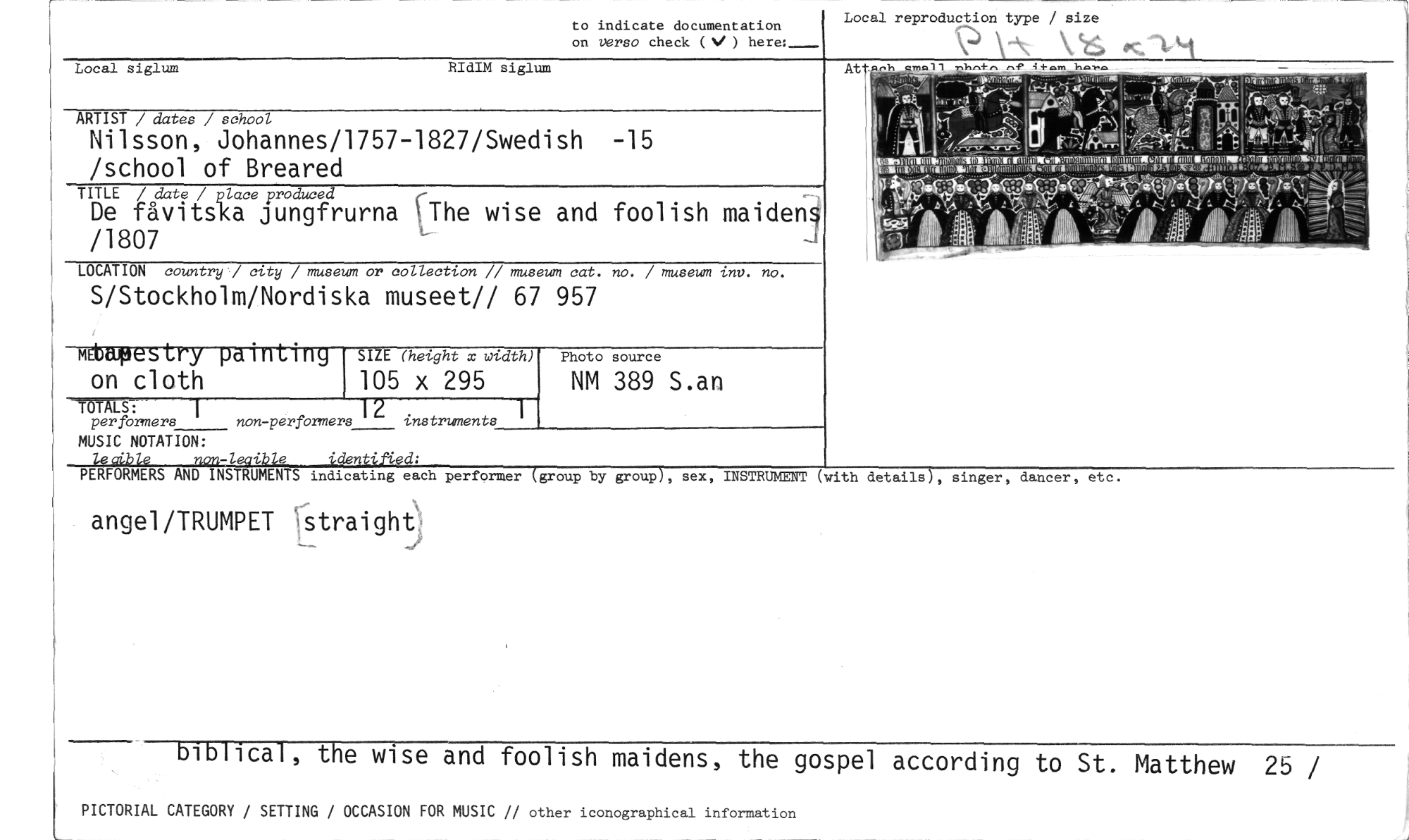 //// Local siglum //// RIdIM siglum //// ^"" //// to indicate documentation on verso check (V ) here: //// ARTIST / dates / school //// Nilsson, Johannes/1757-1827/Swedish -15 /school of Breared //// TITLE / date /place produced //// De fåvitska jungfrurna ¶The wise and foolish maideng /1807 //// Att.ch //// Local reproduction type / size //// - 1-'1,1, 9. n 73nran //// "4"-',7' v //// It0 -k) //// r^r //// 11151~11.1iffleRITTIMITALMäffil~~1IIMITO~47CirgitfflilIPIDeryeril, ' ..111111aTi11014111M111.01MINUTMMINNIEWTMIZIIVWFAIT~:tairmi:Noya ocr AI• //// TN //// LOCATION country7 city / museum or collection // museum cat. no. / museum inv. no. //// S/Stockholm/Nordiska museet// 67 957 //// mebaisestry painting //// on cloth //// SIZE (hevght x multh) //// 105 x 295 //// NM 389 S.an //// Photo source //// LS: //// per formers non-performers instruments //// MUSIC NOTATION: //// leaible non-leaible identified: //// PERFORMERS AND INSTRUMENTS indicating each performer (group by group), sex, //// angel/TRUMPET straight //// e //// INSTRUMENT (with details), singer, dancer, etc. //// biblical, the wise and foolish maidens, the gospel according to St. Matthew 25 / //// PICTORIAL CATEGORY / SETTING / OCCASION FOR MUSIC // other iconographical information ////