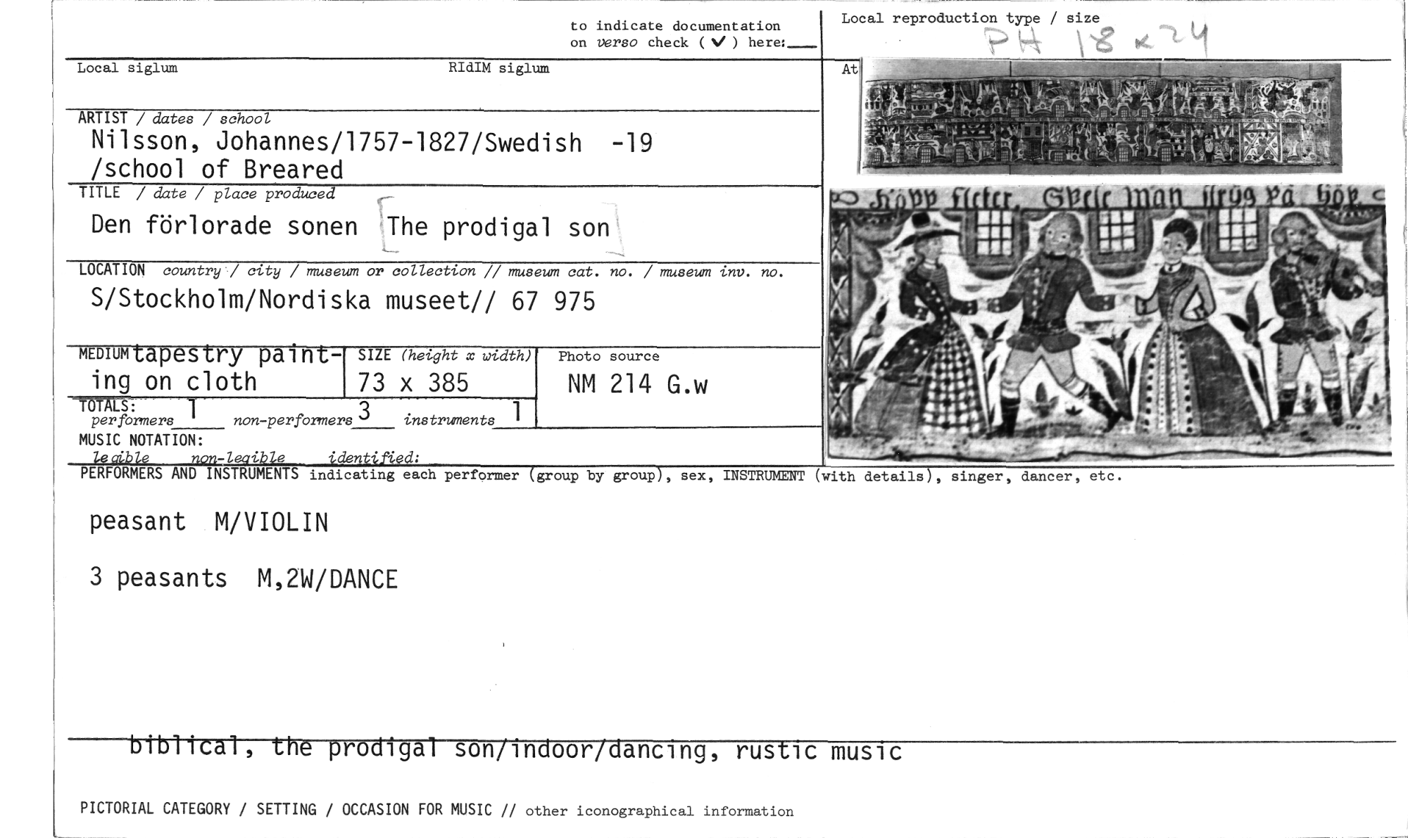 //// Local reproduction type / size //// to indicate documentation on verso check (V ) here: //// Local siglum RIdIM siglum //// ARTIST / dates / school //// Nilsson, Johannes/1757-1827/Swedish -19 /school of Breared //// TITLE / date / place produced //// Den förlorade sonen The prodigal son //// LOCATION country '/ city / museum or collection // museum cat. no. / museum inv. no. //// S/Stockholm/Nordiska museet// 67 975 //// Photo source //// NM 214 G.w //// non-perfbrmers 3 instruments 1 //// peasant M/VIOLIN //// 3 peasants M,2W/DANCE //// biblical, the prodigal son/indoor[dancing, rustic music //// PICTORIAL CATEGORY / SETTING / OCCASION FOR MUSIC // other iconographical information //// MEDIUM tapestry paint- //// ing on cloth -torks. 1 //// per former //// MUSIC NOTATION: //// SIZE (height x width) //// 73 x 385 //// ' e 'den d: //// PERFORMERS AND INSTRUMENTS indicating each performer group by group , sex, INSTRUMENT (with details , s nger, dancer, etc ////