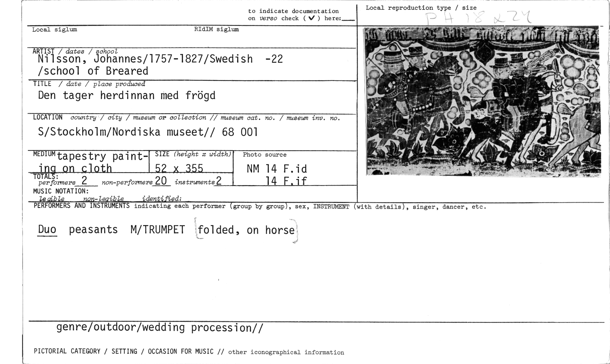 //// Local reproduction type / size //// to indicate documentation //// on verso check (V ) here:_ //// Local siglum RIdIM siglum //// ARTIST / dates / school //// Nilsson, Johannes/1757-1827/Swedish -22 /school of Breared //// TITLE / date / place produced //// Den tager herdinnan med frögd //// LOCATION country / city / museum or collection // museum cat. no. / museum inv. no. //// S/Stockholm/Nordiska museet// 68 001 //// mummtalp estry paint- SIZE (hetght x bm.dth) //// on cloth 52 x 355 //// TO LS: //// per formers 2 non-performers 20 instruments 2 //// MUSIC NOTATION: //// le nble non-leaible identified; //// PERFORMERS AND INSTRUMENTS indicating each performer (group by group), sex, //// Duo peasants M/TRUMPET folded, on horse //// genre/outdoor/wedding procession// //// PICTORIAL CATEGORY / SETTING / OCCASION FOR MUSIC // other iconographical information //// Photo source //// NM 14 F.id //// 14 F.if //// INSTRUMENT (with details), singer, dancer, etc. ////