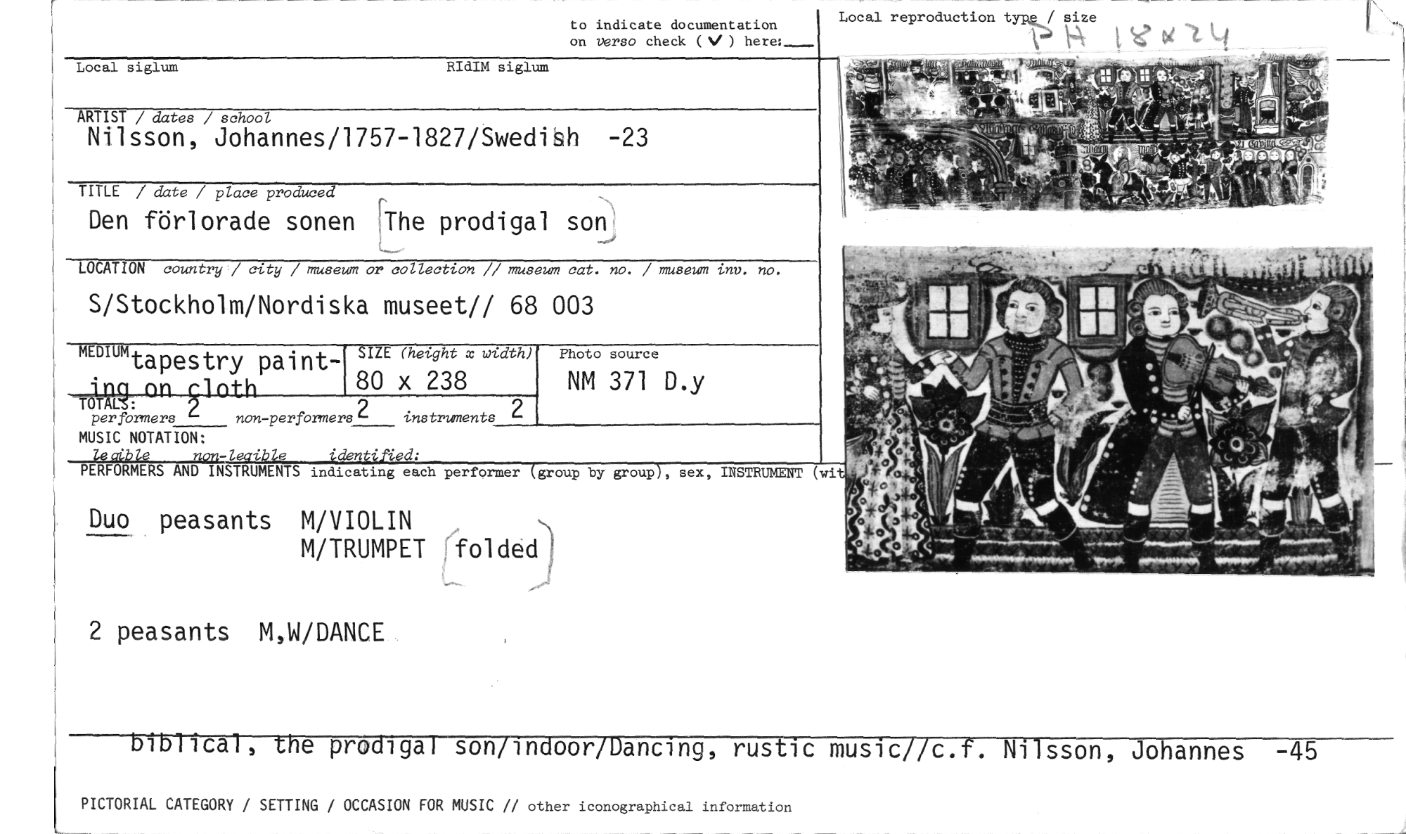 //// to indicate documentation //// on verso check (V ) here:- //// Local reproduction typt / size //// \ \ //// Local siglum //// RIdIM siglum //// ARTIST / dates / school //// Nilsson, Johannes/1757-1827/Swedish -23 //// TITLE / date / place produced //// Den förlorade sonen ,The prodigal son' //// LOCATION country / city / museum or collection // museum cat. no. / museum inv. no. //// S/Stockholm/Nordiska museet// 68 003 //// MEDIUMtapestry pa- SIZE (height x width) //// : " sloth 80 x 238 //// ""rtifig //// per formers non-performers2 instruments 2 //// Fhoto source //// NM 371 D.y //// !I • //// MUSIC NOTATION: //// e .dent. 'ed: //// PERFORMERS AND IN TRUMENTS indicating each performer //// group by group , sex, INSTRUMENT (Id //// Duo peasants M/VIOLIN //// M/TRUMPET :fold6d) //// 2 peasants M,W/DANCE //// biblical, the prodigal son/indoor/Danung, rustic music//c.f. Nilsson, Johannes -45 //// PICTORIAL CATEGORY / SETTING / OCCASION FOR MUSIC // other iconographical information ////