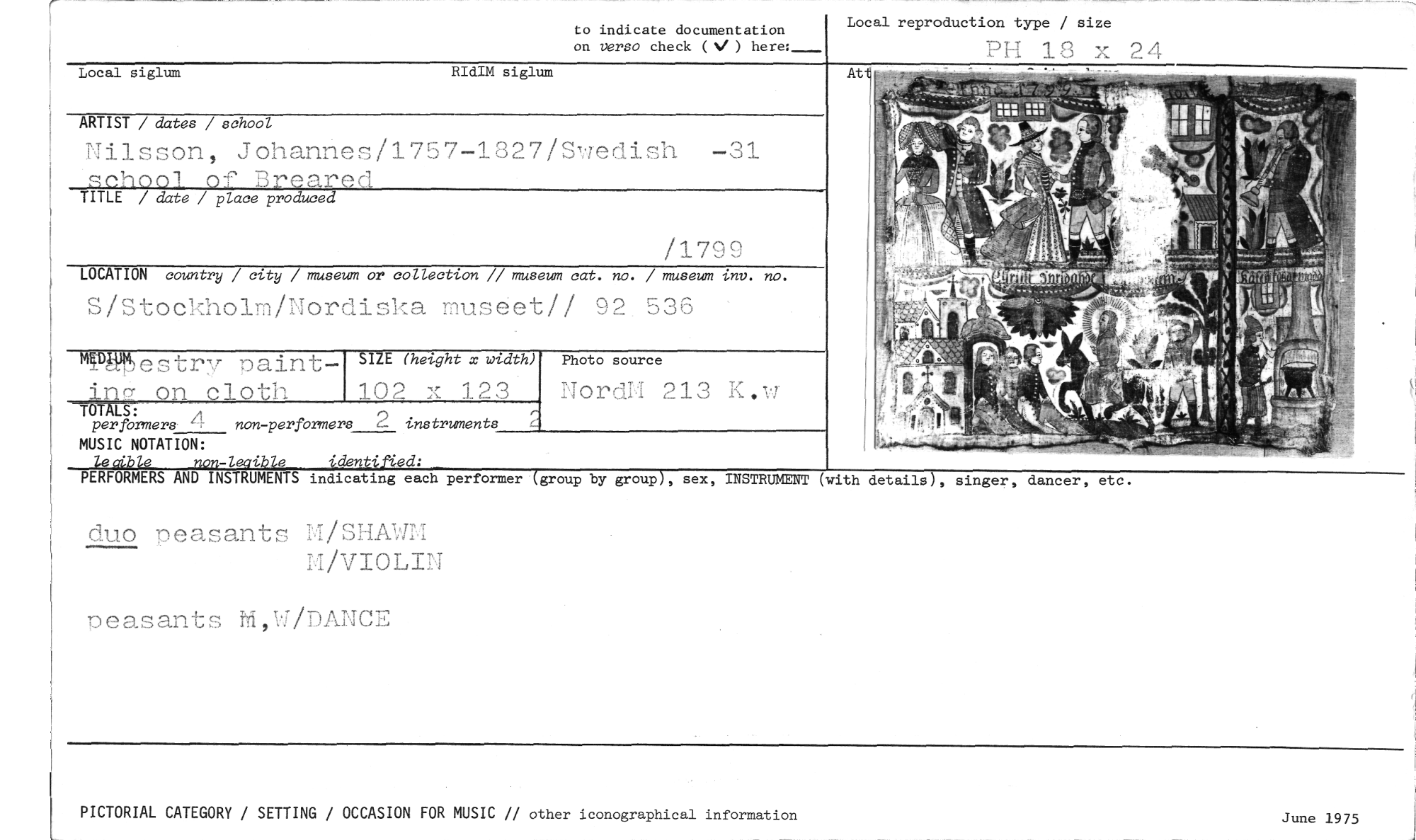 //// Local reproduction type / size //// PH 13 x 24 //// At //// to indicate documentation //// on verso check (V) here:___ //// Local siglum RIdIM siglum //// ARTIST / dates / school //// Nilsson, Johannes/1757-1827/Swedish -31 //// school of Brearecl //// TITLE / date / place produced //// /1799 //// LOCATION country / city / museum or collection // museum cat. no. / museum inv. no. //// S/Stockholm/Nordiska museet// 92 536 //// ml-DMI)estr,r naint SIZE (heIght x width) TOTAL on cloth //// OTAL : 102 x 123 //// perfbrmers non-perfbrmers 2 instruments //// MUSIC NOTATION: //// lealbje non-teaible identified: //// PERFORMERS AND INSTRUMENTS indicating each performer //// duo peasants M/SHAWM //// M/VIOLIN //// peasants M,W/DANCE //// Photo source //// NordM 213 K..0 //// (group by group), sex, INSTRUMENT (with details), singer, dancer, etc. //// PICTORIAL CATEGORY / SETTING / OCCASION FOR MUSIC // other iconographical information //// June 1975 ////