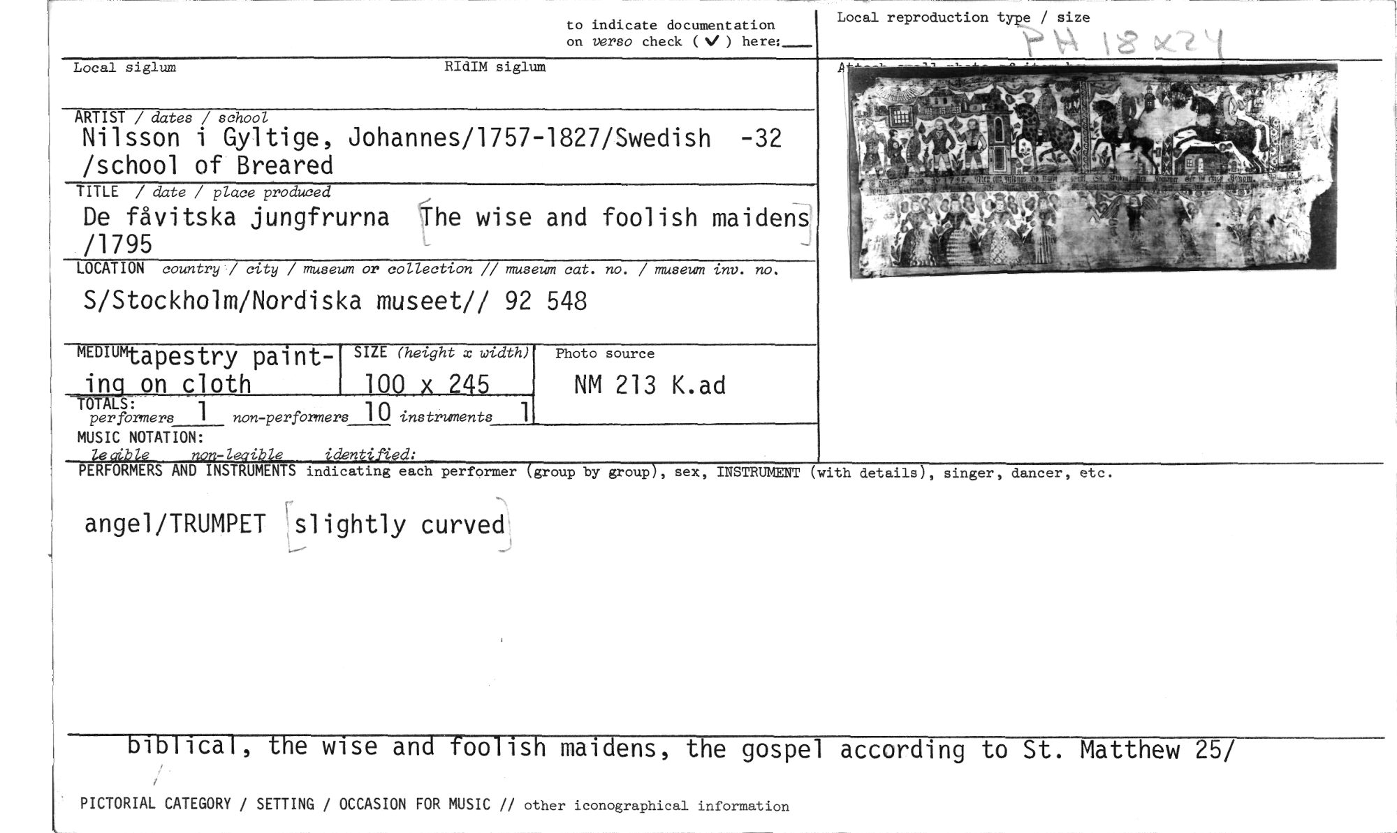 //// to indicate documentation on versa check (N/ ) here: //// Local reproduction type / size //// Local siglum RIdIM siglum //// ARTIST / dates / school //// Nilsson i Gyltige, Johannes/1757-1827/Swedish -32 /school of Breared //// TITLE / date / place produced //// De fåvitska jungfrurna The wise and foolish maidens /1795 //// LOCATION country / city / museum or collection // museum cat. no. / museum inv. no. //// S/Stockholm/Nordiska museet// 92 548 //// molutapestry paint- //// Photo source //// ing on cloth //// NM 213 K.ad //// SIZE (height x width) //// 100 x 245 //// TOTKLS: //// performers 1 non-performers 10 instruments //// MUSIC NOTATION: //// e 'lent' //// PERFORMERS AND INSTRUMENTS indicating each performer group by group , sex, INSTRUMENT (with details), singer, dance , etc. //// angel/TRUMPET slightly curved //// biblical, the wise and foolish maidens, the gospel according to St. Matthew 25/ //// PICTORIAL CATEGORY / SETTING / OCCASION FOR MUSIC // other iconographical information ////