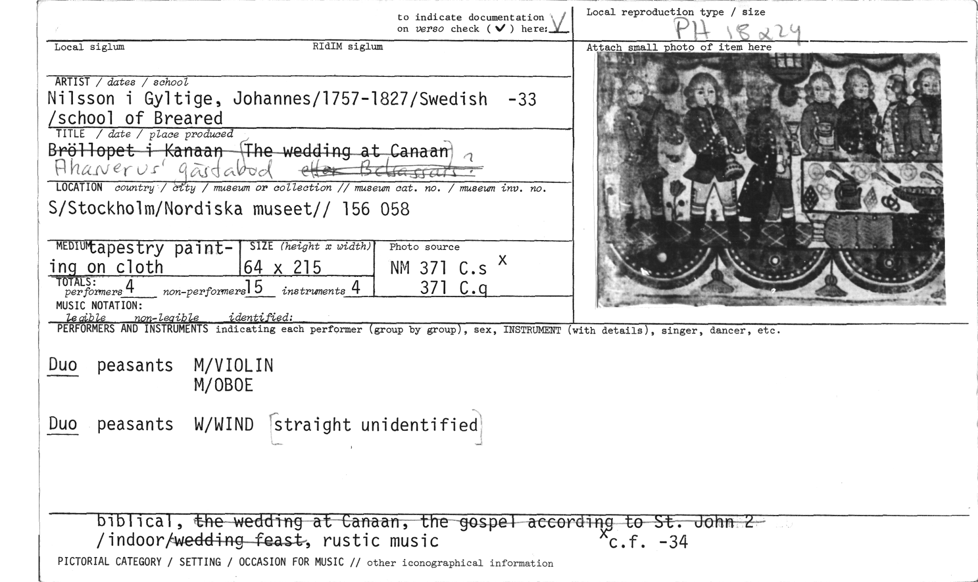 //// mulubtapestry paint- //// SIZE (height x tnclth) //// to indicate documentation //// on verso check (V ) here:_ //// Local reproduction type / size //// \s 74 G.4 //// RIdIM siglum //// ARTIST / dates / school //// Nilsson i Gyltige, Johannes/1757-1827/Swedish -33 //// /school of Breared //// TITLE / date / place produced //// P fria-Ner L)-r Cl'escA -e{4782=t2LP'aft4 //// ; . - - e e //// LOCATION country / å•ety / museum or collection // museum cat. no. / museum inv. no. //// S/Stockholm/Nordiska museet!! 156 058 //// ing on cloth 64 x 215 //// ToTALs: A //// performers". non-perfortners15 instruments 4 //// MUSIC NOTATION: //// leaible non-leaible identified: //// PERFORMERS AND INSTRUMENTS indicating each performer (group by group), sex, INSTRUMENT //// Duo peasants M/VIOLIN //// M/OBOE //// Duo peasants W/WIND straight unidentified //// Local siglum //// Photo source //// NM 371 C.s x //// 371 C.q //// bi b 1 i ca I , ateercl-ip //// /indoori-wed~g—feast-, rustic music c.f. -34 //// PICTORIAL CATEGORY / SETTING / OCCASION FOR MUSIC // other iconographical information //// (with details), singer, dancer, etc. ////
