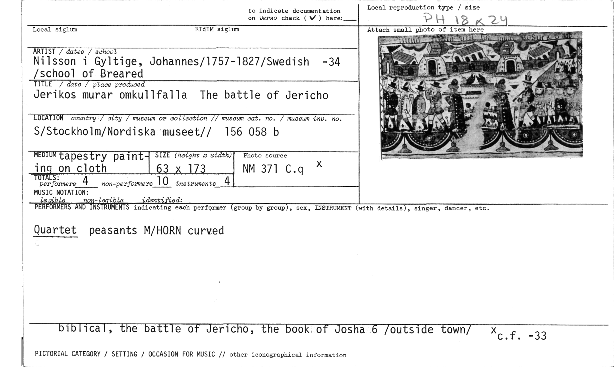 //// Local reproduction type / size //// 11 //// Attach //// to indicate documentation //// on verso check ( ) here:_ //// Local siglum RIdIM siglum //// ARTIST / dates / school //// Nilsson i Gyltige, Johannes/1757-1827/Swedish -34 /school of Breared //// TITLE / date / place produced //// Jerikos murar omkullfalla The battle of Jericho //// LOCATION country / city / museum or collection // museum cat. no. / museum inv. no. //// S/Stockholm/Nordiska museet// 156 058 b //// mmumtapestry paint- SIZE (hetght x width) Photo source //// ing on cloth 63 x 173 NM 371 C.q X //// TOTALS: //// per formers 4 non -performers 10 instruments //// MUSIC NOTATION: //// lecible non-leaible identified: //// PERFORMERS AND INSTRUMENTS indicating each performer (group by group), sex, INSTRUMENT //// Quartet peasants M/HORN curved //// biblical, the battle of Jericho, the book of Josha 6 /outside town/ xc.f. _33 //// PICTORIAL CATEGORY / SETTING / OCCASION FOR MUSIC // other iconographical information //// 4 //// (with details), Ginger, dancer, etc. ////