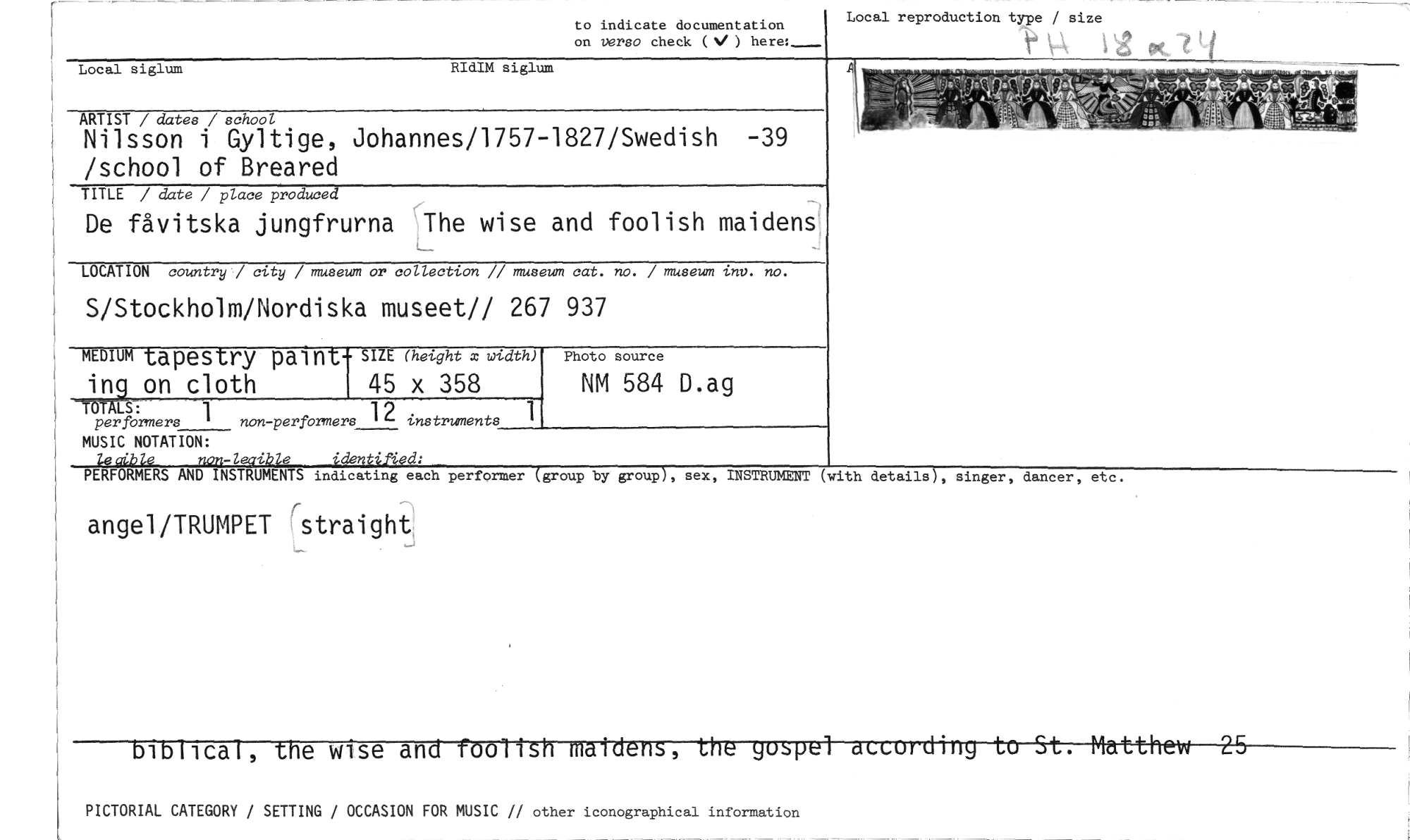 //// Local reproduction type / size //// to indicate documentation //// on versa check (V ) here:_ //// Local siglum RIdIM siglum //// ARTIST / dates / school //// Nilsson i Gyltige, Johannes/1757-1827/Swedish -39 /school of Breared //// TITLE / date / place produced //// De fåvitska jungfrurna The wise and foolish maidens //// LOCATION country / city / museum or collection // museum cat. no. / museum inv. no. //// S/Stockholm/Nordiska museet// 267 937 //// MEDIUM tapestry paint- SIZE (height x bxidth) //// in• on cloth 45 x 358 //// per formers 1 non-perfermers 12 instruments //// LS //// MUSIC NOTATION: //// leaible non-leaible__ //// PERFORMERS AND INSTRUMENTS //// angel/TRUMPET straight //// Photo source //// NM 584 D.ag //// indicating each performer (group by group), sex, INSTRUMENT (with details), singer, dancer, etc. //// ica , e wise an •O //// PICTORIAL CATEGORY / SETTING / OCCASION FOR MUSIC // other iconographical information ////