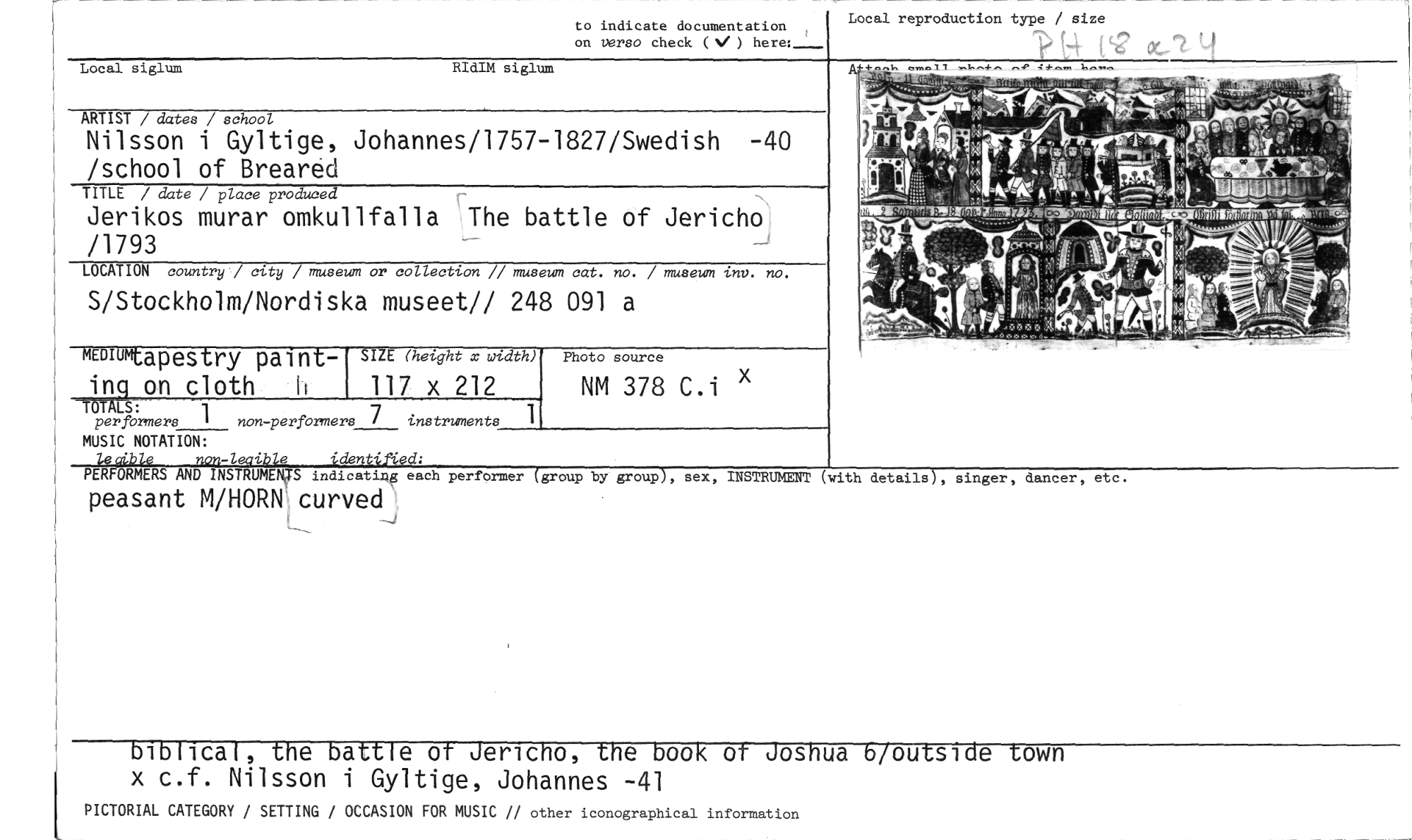 //// Local reproduction type / size //// rim;; //// to indicate documentation on versa check ( ) //// Local siglum RIdIM siglum //// ARTIST / dates / school //// Nilsson i Gyltige, Johannes/1757-1827/Swedish -40 /school of Breared //// TITLE / date / place produced //// Jerikos murar omkullfalla The battle of Jericho /1793 //// LOCATION country / city / museum or collection // museum cat. no. / museum inv. no. //// S/Stockholm/Nordiska museet// 248 091 a //// moiumt apestry paintinq on cloth h //// —ToTALs: //// per formers 1 non-performers 7 instruments //// SIZE (hetght x width) //// 117 x 212 //// 1 //// Photo source //// NM 378 C.i x //// MUSIC NOTATION: //// le ble non-leaible identif4ed: //// PERFORMERS AND INSTRUMENTS indicating each performer (group by group), sex, INSTRUMENT //// peasant M/HORN curved //// (with details), singer, dancer, etc. //// biblical, the battle ot Jericho, the book ot Joshua b/outside town //// x c.f. Nilsson i Gyltige, Johannes -41 //// PICTORIAL CATEGORY / SETTING / OCCASION FOR MUSIC // other iconographical information ////