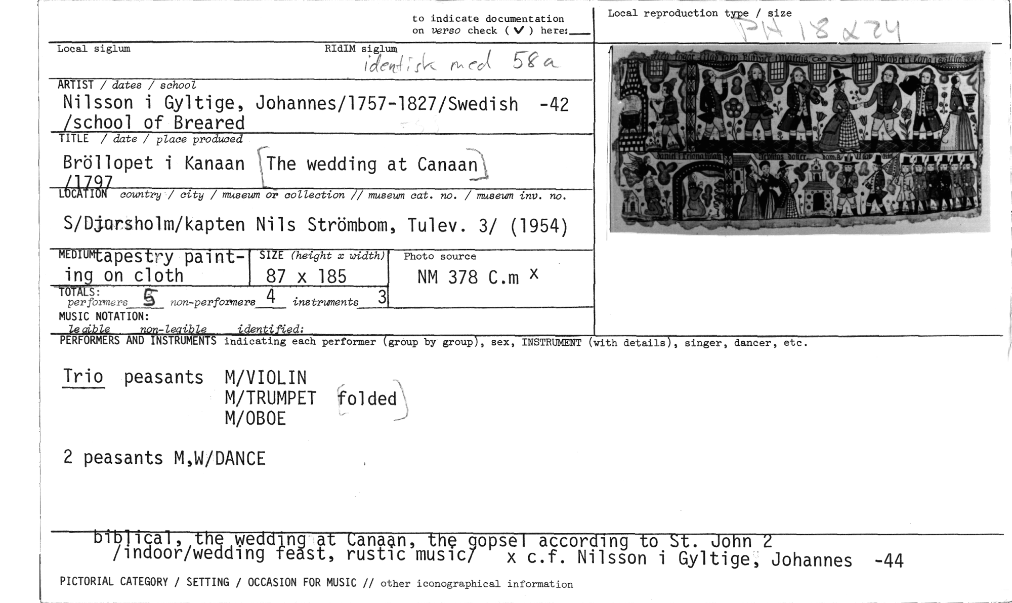 //// to indicate documentation //// on verso check ( ) here:_ //// Local reproduction type / size //// Local siglum RIdIM siglum //// idet jk 6^ ed( 5-e. a //// ARTIST / dates / school //// Nilsson i Gyltige, Johannes/1757-1827/Swedish -42 /school of Breared //// TITLE / date / place produced //// Bröllopet i Kanaan wedding at CanaanA //// LX2N country / city / museumöi. collection // museum cat. no. / museum inv. no. //// S/Djorsholm/kapten Nils Strömbom, Tulev. 3/ (1954) //// MEDIU mtapestry paintin on cloth //// per formers non-performers 4 instruments //// LS: //// MUSIC NOTATION: //// le alble non-leaible identified: //// PERFORMERS AND INSTRUMENTS //// Photo source //// NM 378 C.m x //// 3 //// (with details4, singer, danser, etc. //// indicating each performer (group by group), sex, INSTRUMENT //// Trio peasants M/VIOLIN //// M/TRUMPET folded' M/OBOE //// 2 peasants M,W/DANCE //// SIZE (height x width) //// 87 x 185 //// biblical, the weddinq at Canaan, the gopsel according to St. John -2 //// /indoor/wedding teast, rustic musica x c.f. Nilsson i Gyltige, Johannes -44 //// PICTORIAL CATEGORY / SETTING / OCCASION FOR MUSIC // other iconographical information ////