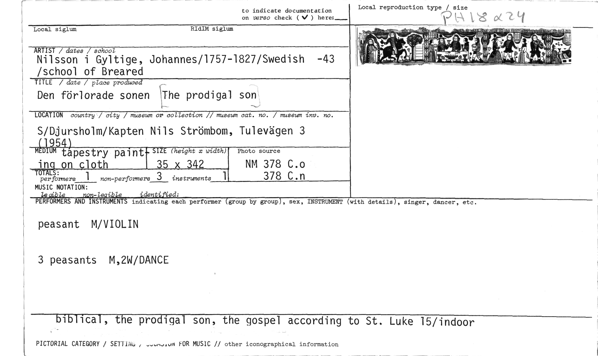 //// Local reproduction type / size //// ? '8 //// to indicate documentation //// on versa check ( ) here:- //// Local siglum RIdIM siglum //// ARTIST / dates / school //// Nilsson i Gyltige, Johannes/1757-1827/Swedish -43 /school of Breared //// TITLE / date / place produced //// Den förlorade sonen ''The prodigal son //// LOCATION country / city / museum or collection // museum cat. no. / museum inv. no. //// S/Djursholm/Kapten Nils Strömbom, Tulevägen 3 //// (1954) //// MEDIUM tapestry pal nt- SIZE (height x width) Photo source //// ing on cloth 35 x 342 NM 378 C.o //// TOTALS: //// performers 1 non-performers 3 instruments 1 378 C.n //// MUSIC NOTATION: //// non-leaible identifted: //// PERFORMERS AND INSTRUMENTS indicating each performer (group //// by group), sex, INSTRUMENT (with details), singer, dancer, etc. //// peasant M/VIOLIN //// 3 peasants M,2W/DANCE //// biblical, the prodigal son, the gospel according to St. Luke 15/indoor //// PICTORIAL CATEGORY / SET11åL, , FOR MUSIC // other iconographical information ////
