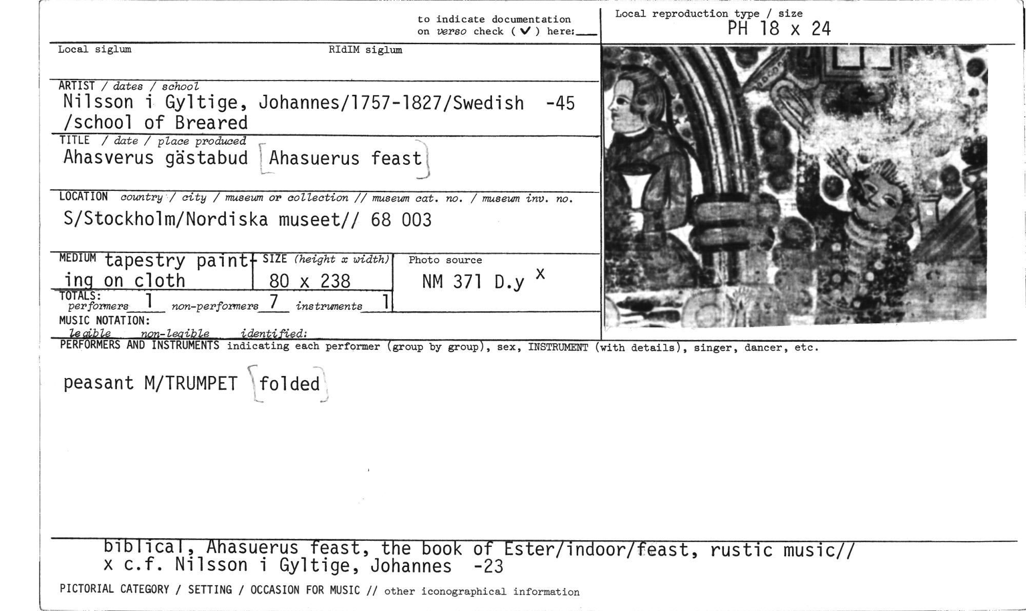 //// peasant M/TRUMPET folded //// biblical, Ahasuerus feast, the book of Ester[indoor/feast, rustic music!! x c.f. Nilsson i Gyltige, Johannes -23 //// PICTORIAL CATEGORY / SETTING / OCCASION FOR MUSIC // other iconographical information //// to indicate documentation //// on torso check (V ) here:- //// Local reproduction type / size //// PH 18 x 24 //// Local siglum //// RIdIM siglum //// ARTIST / dates / school //// Nilsson i Gyltige, Johannes/1757-1827/Swedish -45 /school of Breared //// TITLE / date / place produced //// Ahasverus gästabud ±Ahasuerus feast, //// LOCATION country / city / museum or collection // museum cat. no. / museum inv. no. //// S/Stockholm/Nordiska museet// 68 003 //// MEDIUM tapestry paint- SIZE (height x width) //// ing on cloth 80 x 238 //// TOTALS: 1 //// per formers non-perfbrmers 7 instruments //// MUSIC NOTATION: //// lecible non-leaible identified: //// PERFORMERS AND INSTRUMENTS indicating each performer (group by group), sex, INSTRUMENT (with details), singer, dancer, etc. //// • //// Photo source //// NM 371 D.y x ////