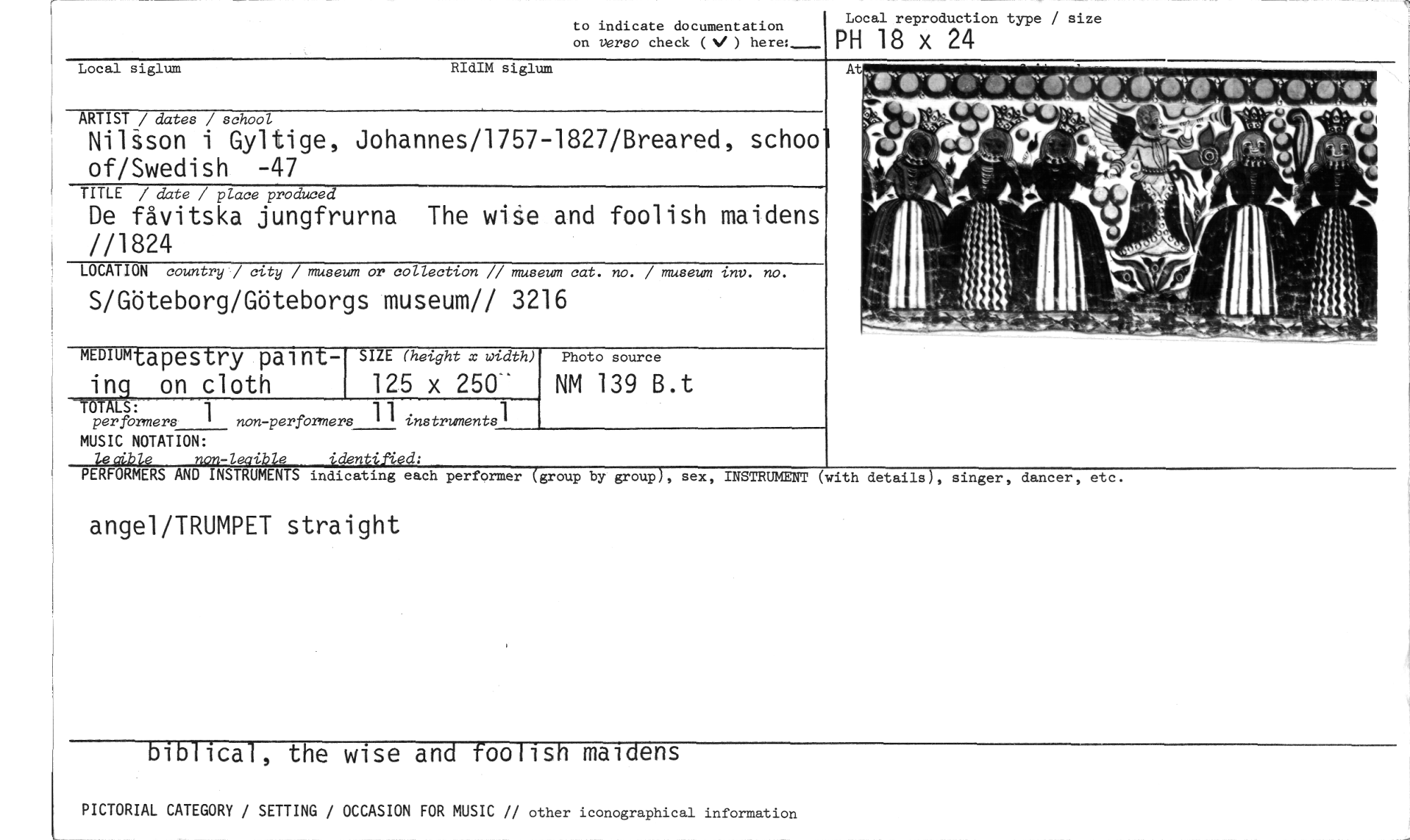 //// to indicate documentation //// on verso check (V ) here:_ //// Local reproduction type / size //// PH 18 x 24 //// Local siglum RIdIM siglum //// ARTIST / dates / school //// Nilåson i Gyltige, Johannes/1757-1827/Breared, schoo of/Swedish -47 //// "VO //// IRa c, //// 11 //// TITLE / date / place produced //// De fåvitska jungfrurna The wire and foolish maidens //1824 //// LOCATION country / city / museum or collection // museum cat. no. / museum inv. no. //// S/Göteborg/Göteborgs museum// 3216 //// MEDIUM tapestry paint- //// Photo source //// NM 139 B.t //// SIZE (height x width) //// 125 x 250- //// in• on cloth //// TOTALS:- //// per formers 1 non-performers 1 instruments1 //// MUSIC NOTATION: //// le aible non-leaible identified: //// PERFORMERS AND INSTRUMENTS indicating each performer (group by group), sex, //// INSTRUMENT (with details), singer, dancer, etc. //// angel/TRUMPET straight //// biblical, the wise and foolish maidens //// PICTORIAL CATEGORY / SETTING / OCCASION FOR MUSIC // other iconographical information ////